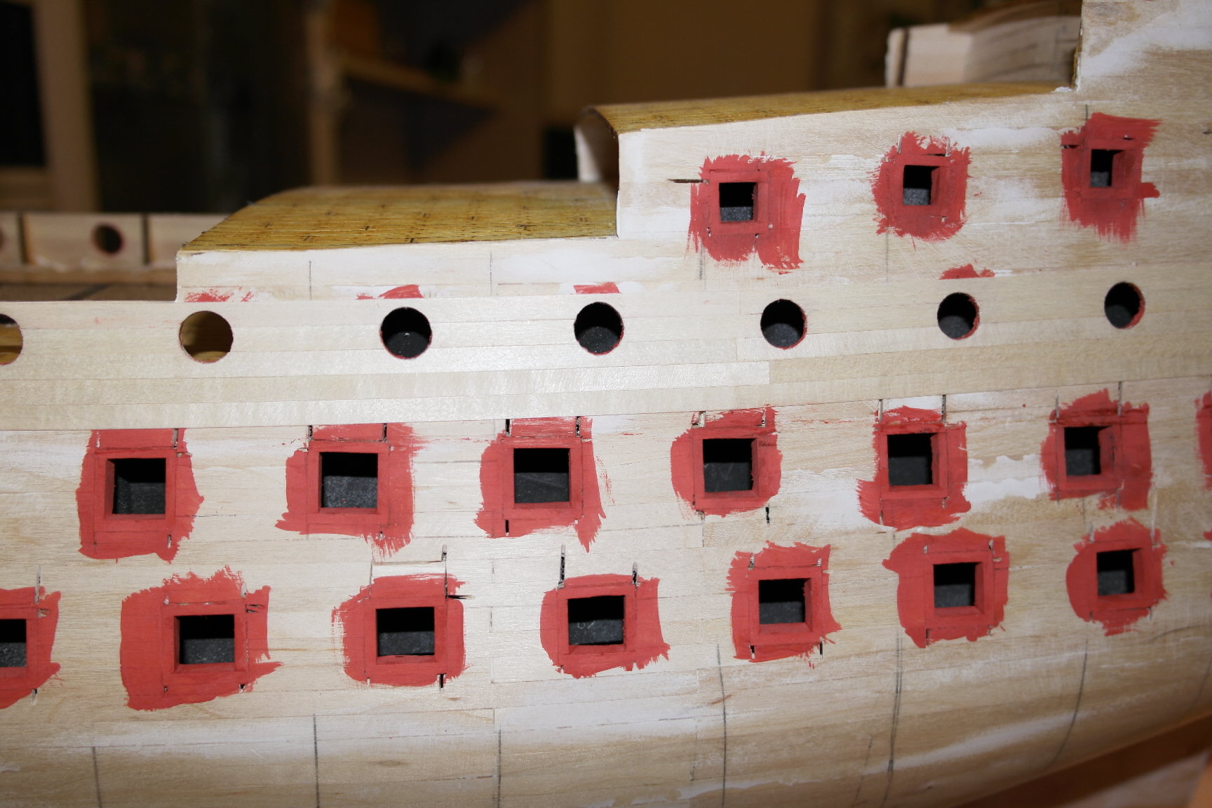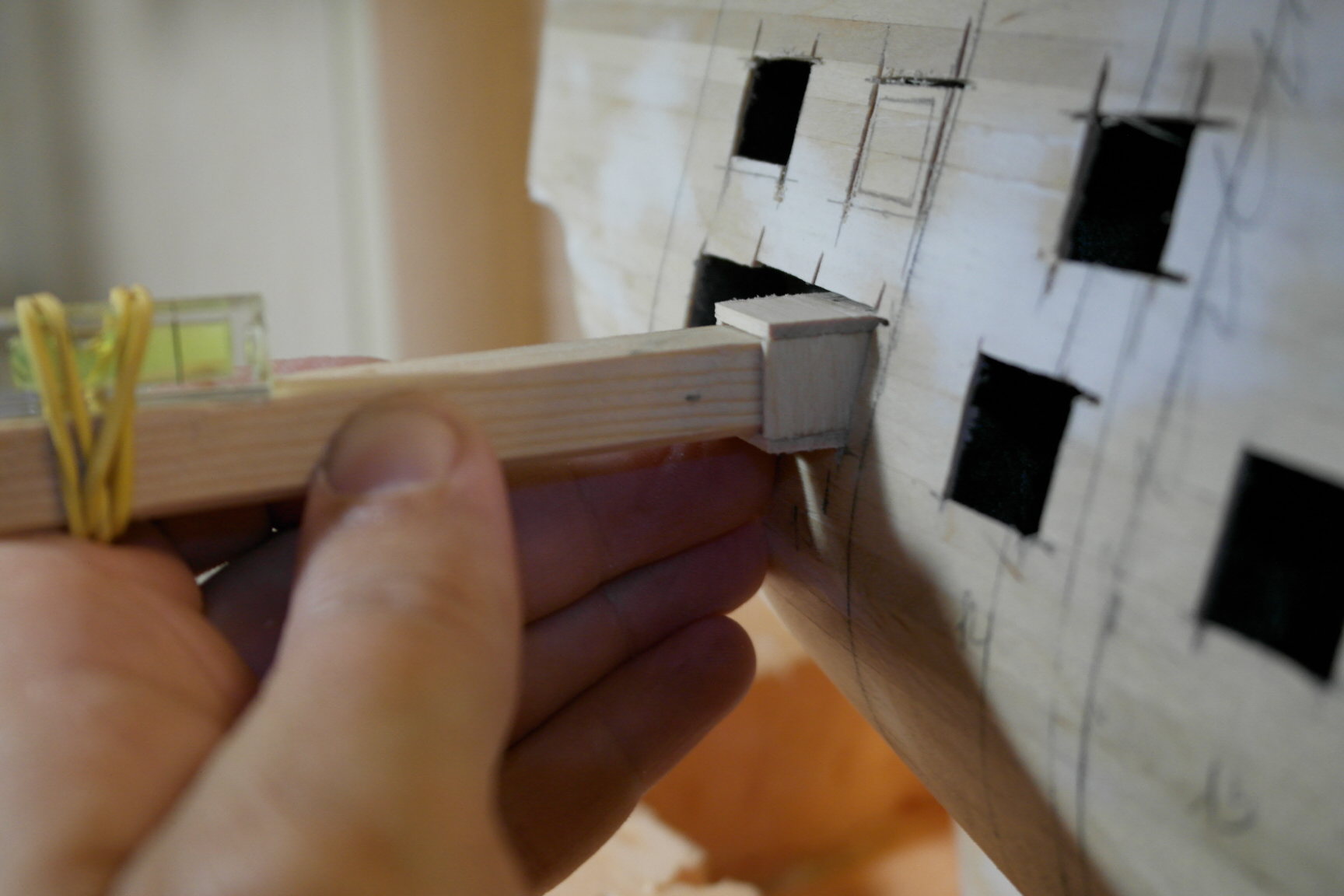 И установка портов на корабль. Устанавливал опять таки по уровню. Сначала вставляем заготовку в отверстие в борту и отчеркиваем профиль борта на заготовке, затем лобзиком выпиливаем порт с нужным профилем борта. Я брал толщину косяков порта 4 мм. Выпиливал с небольшим припуском. Затем лишнее сниму шлифовкой. Где отверстие под порт больше, чем требуется, делал вставки из планок палубного настила.