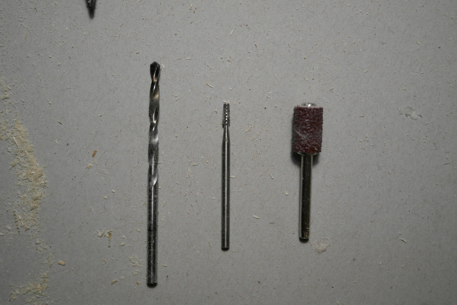 Теперь круглые порты. Использовал вот такой инструмент. Сверло, фреза (по-моему зубная. откуда она у меня, ума не приложу :D ) и круглая насадка с наждачкой для бормашинки