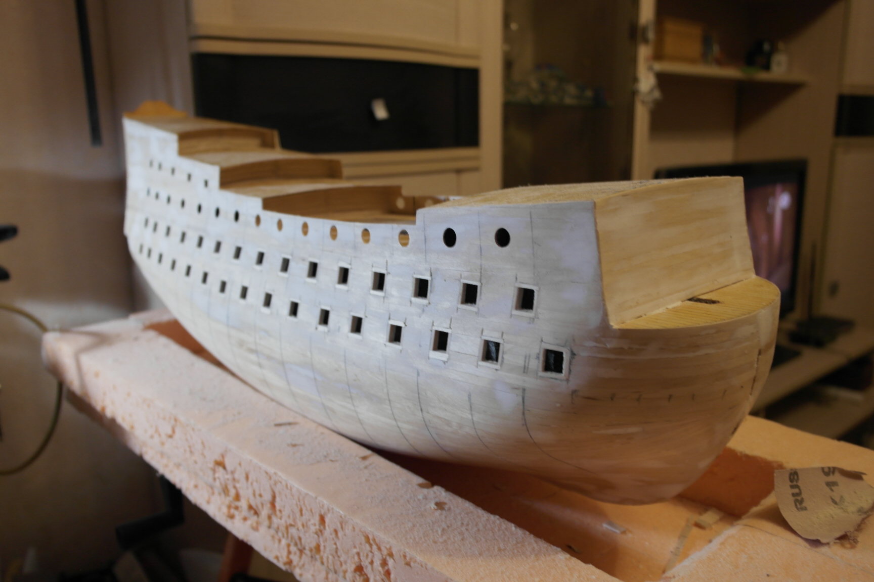 Ну что ж, я вернулся. Закончился длительный перерыв в строительстве корабля. Начинаю продолжать :D . Долго раздумывал, стоит ли и дальше вести ветку на форуме. К сожалению, форум популярностью не пользуется. Решил, что пока продолжу, а там видно будет. На сегодня почти закончил с портами, но все по порядку. И так, зачистил корпус наждачкой, подготовил к шпаклеванию
