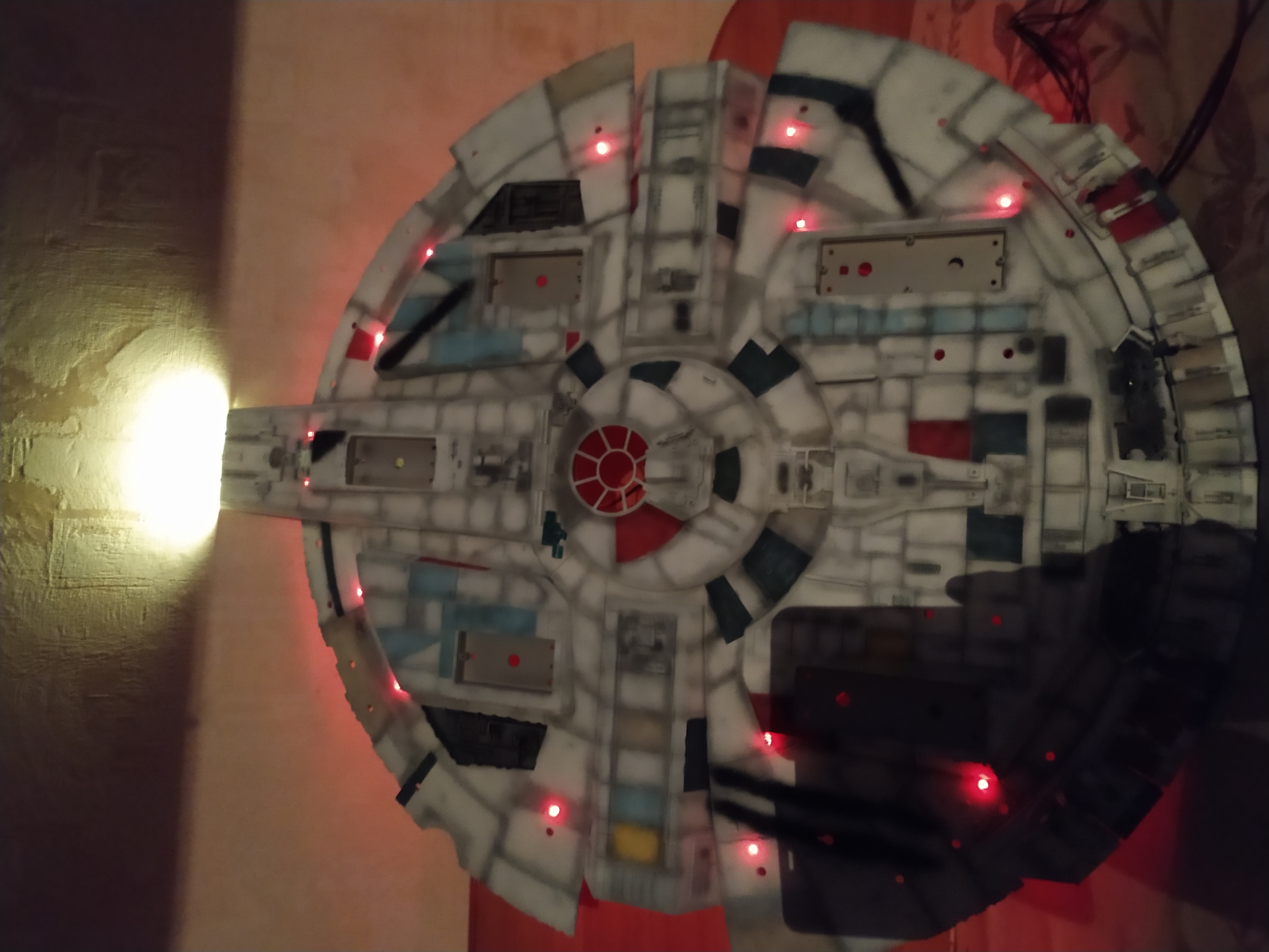 Я сейчас смотрю 7 эпизод Звездных Войн. Сокол там во всей красе и деталях. Я не буду сходить с ума по электрике, мне достаточно стандартного набора! Но, вот на что не пожалею денег, чтобы себя порадовать и других уивить, так это приглашу профессиональную художницу, попрошу просмотреть ее все кадры из последней трилогии и добиться путем раскраски полного сходства с тем самым потрепанным, ржавым и видавшим виды Тысячелетним Соколом!!!