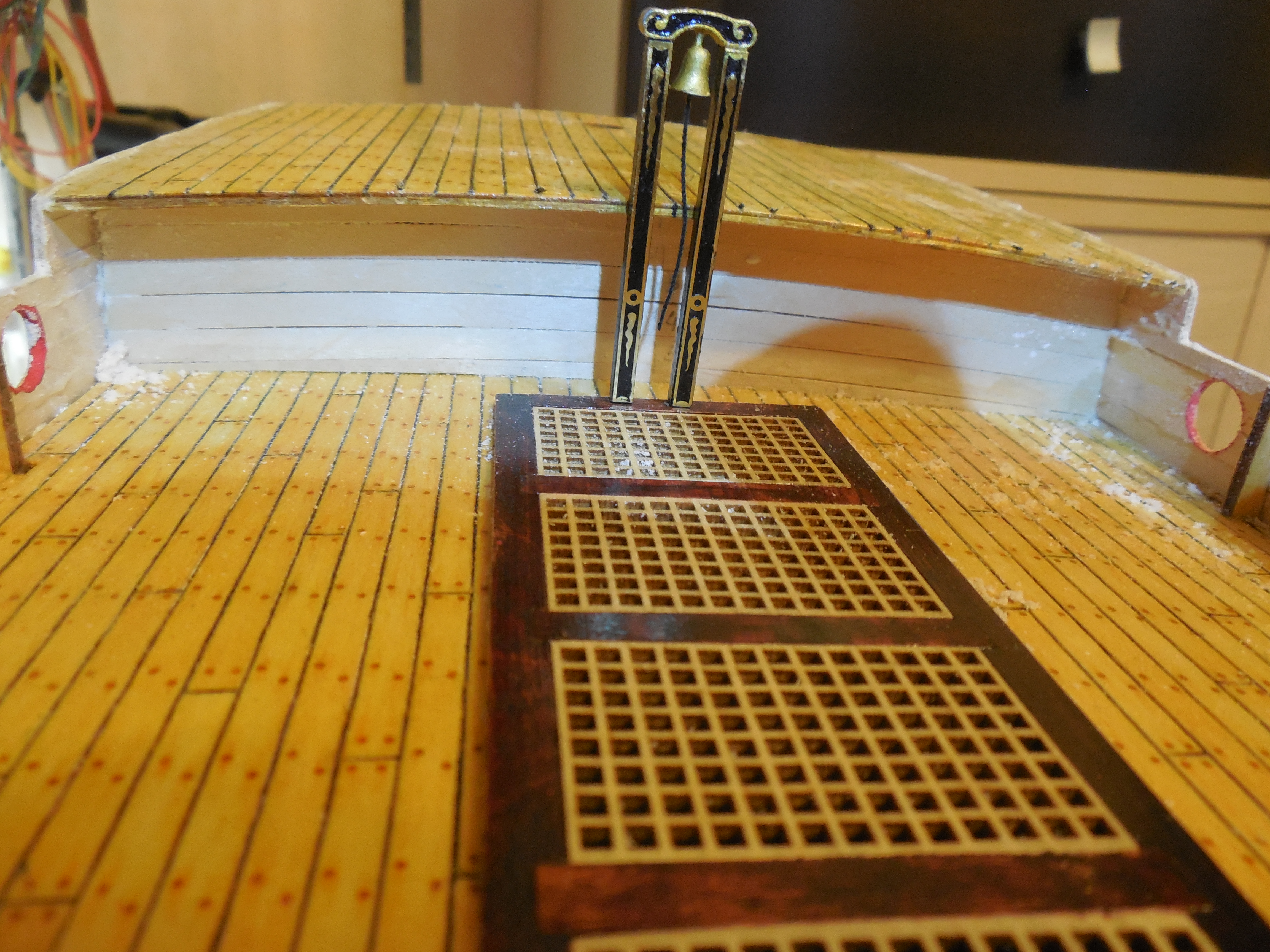 . Из-за погиби палубы верхняя точка палубы оказалась приблизительно на 3 мм выше, чем было рассчитано. Но это полбеды. Я промахнулся с размещением рустерной решетки и колокольня встала на комингс люка и чуть-чуть не по центру