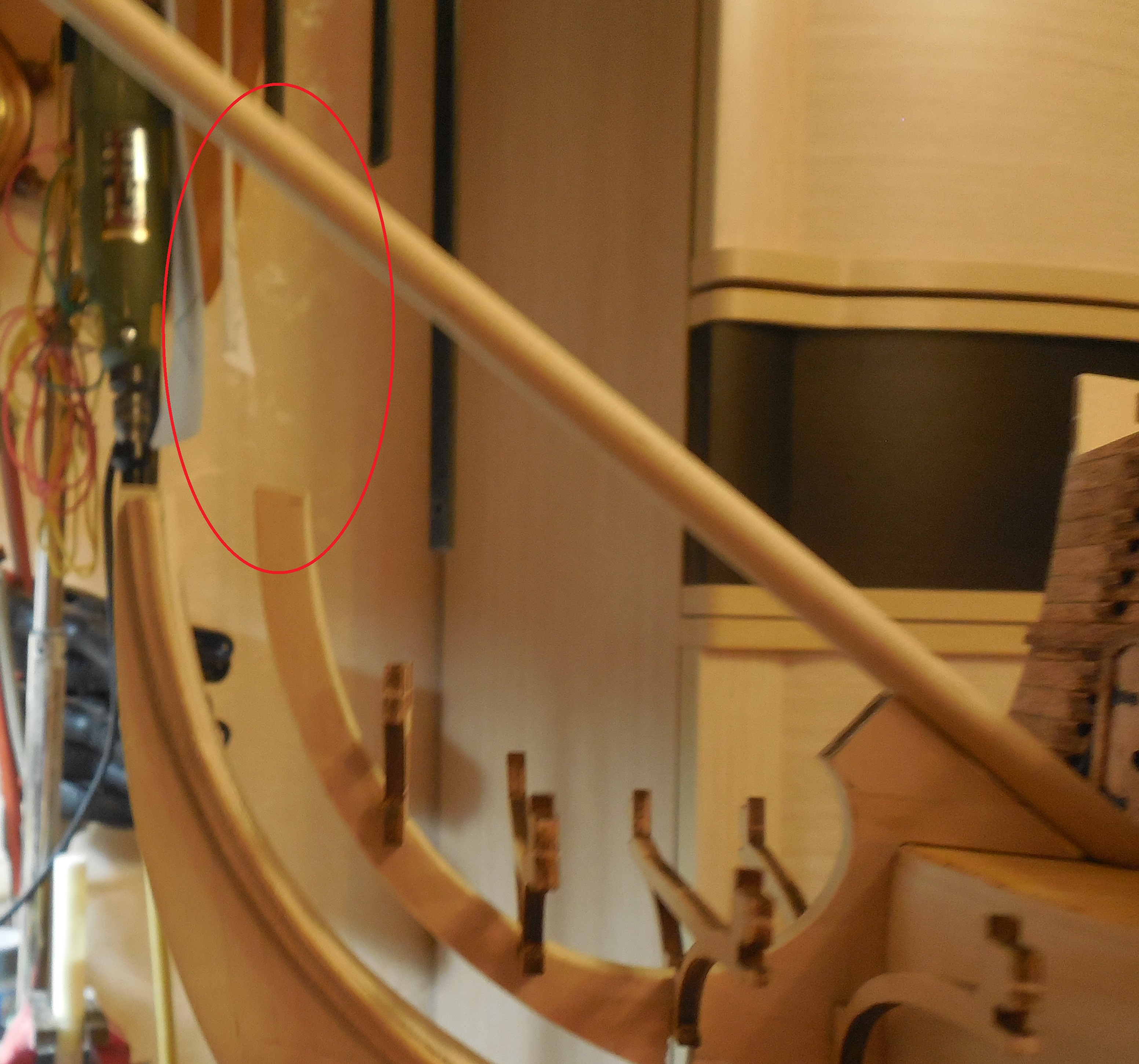 Установил релинги бортов. Тут ничего интересного. Все чисто по журналу. Есть небольшие косячки. Кое-где пришлось приклеить на торцы планочки. Обнаружились провальчики на черновой обшивке. Пришлось устранять. Да, поторопился с зашивкой чистовой обшивкой верхней части бортов. Пришлось отдирать и клеить заново. Ну и перед установкой релингов зашил фальшборт планками от чистовой обшивки. Ну и в соответствии с предыдущими постами, звонница на реконструкции
