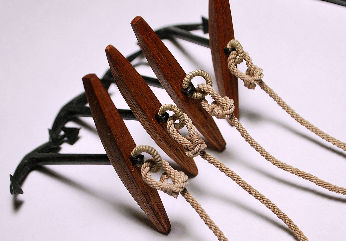 Для обтяжки штагов по книжкам надо на Повелитель ставить юферсы, но штаг-блоки уже заготовлены, а для грота-штага вырезаны из груши. Жалко, поставлю их.