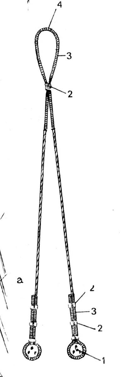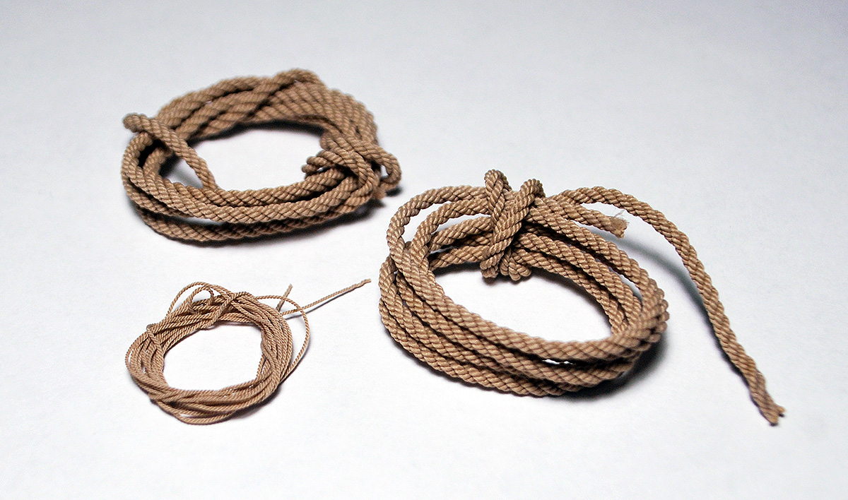 Канат кабельной работы навил из нитки Gutermann для оверлоков. Это довольно тонкая мононить, можно навить канат любой толщины, взяв нужное количество прядей. Толщину подбирал визуально, до 2 мм все казалось тонко, 2 мм - нормально, но можно было и толще сделать - 2,5 мм. Узел старался сделать как на рисунке, получилось вроде неплохо.