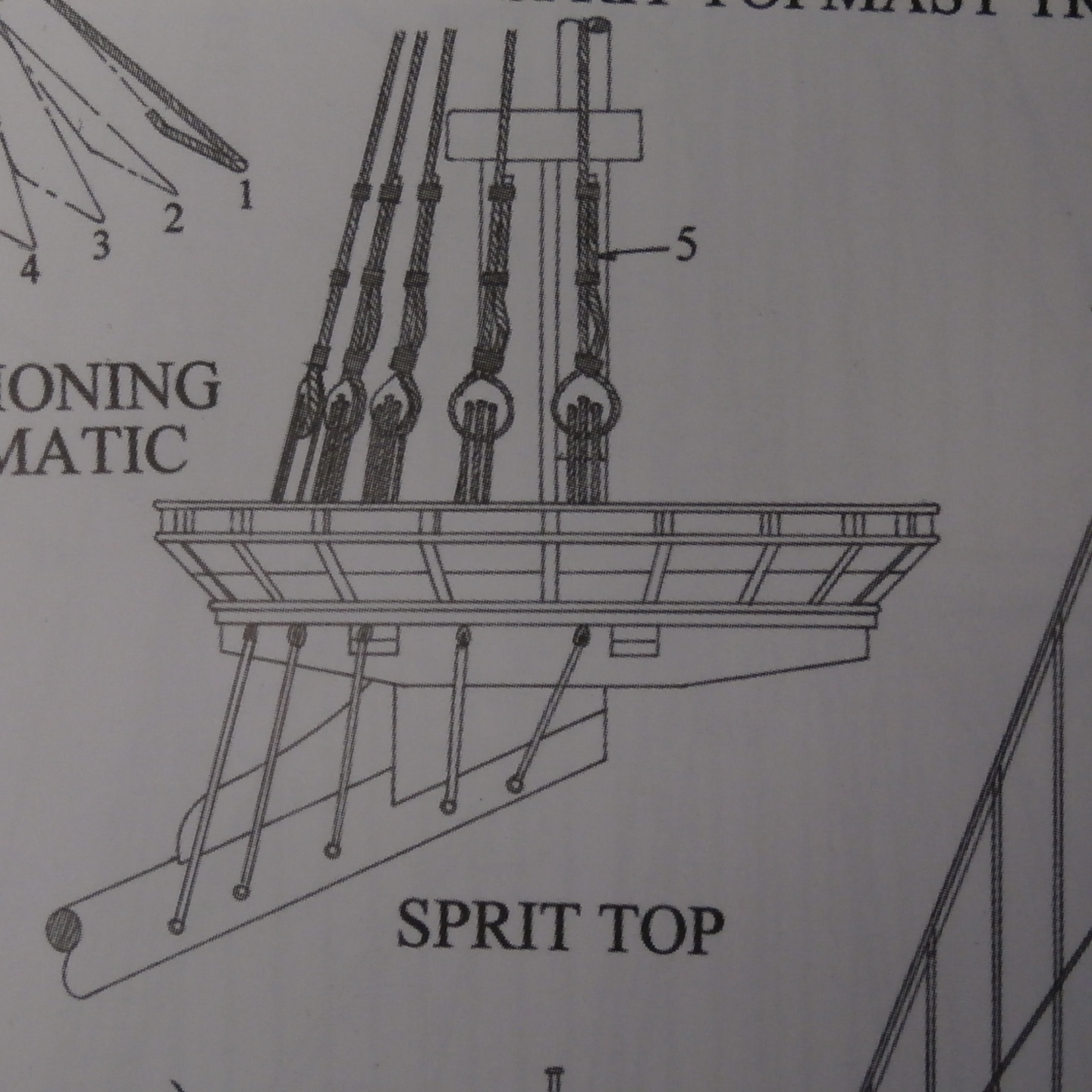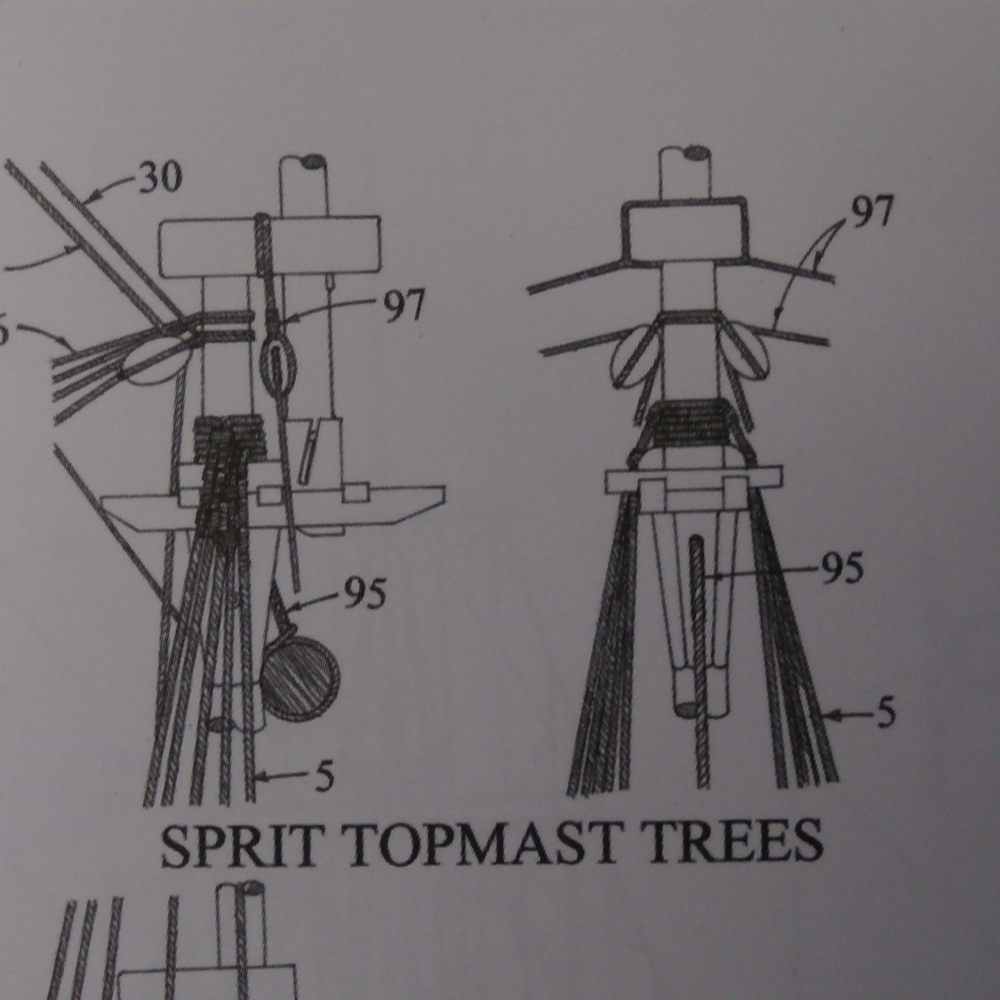 Поставил ванты блинда-стеньги в качестве тренировки перед вантами главных мачт. Юферсы на стеньгах буду использовать из журнала, а на нижних вантах будут покупные. Руководствовался вот этой картинкой из Курти, но чем больше погружался в вопрос, тем больше понимал, что все сделал не совсем неправильно - и трос навил в другую сторону, и бензель при обвязке юферса поставил не так, и конец ванты не с той стороны привязал. Теперь знаю как правильно, но и упростить где-то тоже охота.