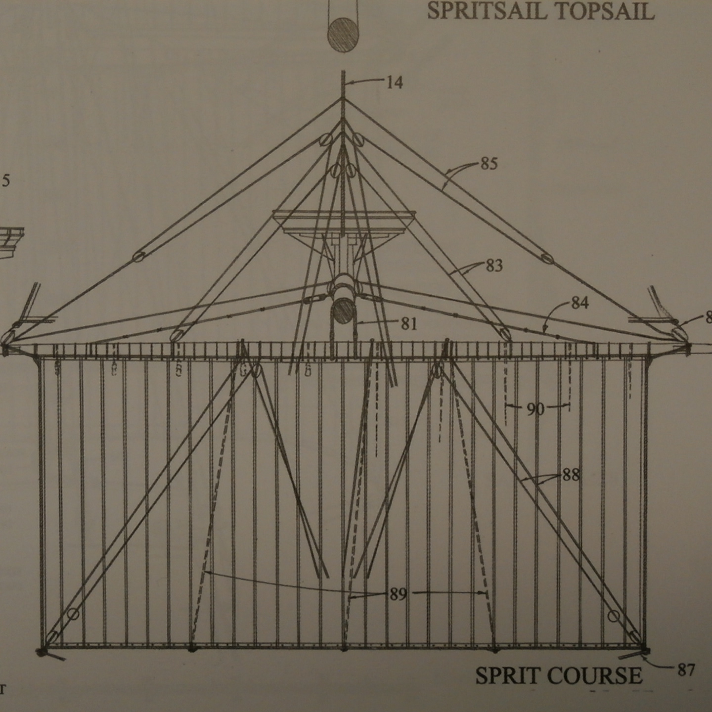 Приветствую! Возможно я ошибаюсь, но, мне кажется, что бом-блинда-стеньга слишком далеко расположена от блинда-стеньги (отверстия в эзельгофте слишком разнесены). И нижнее крепление бом-блинда-стеньги неверное... Там вроде как и на мачтах салинг ставился