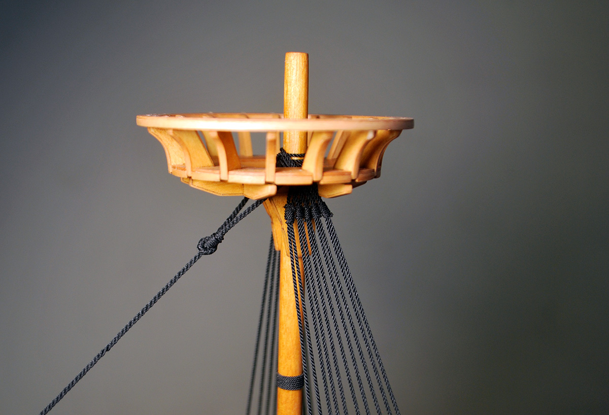 Вполне с вами согласен. Обычно мачты на модель монтируют по - классике:мачта,ванты,штаг, затем стеньгу. Второй вариант: - вязать огон уже на месте, но уж больно муторно. Но есть еще и третий вариант: Мачту собирают по горизонтали на стапеле из прямоугольных брусков и на столе же к мачте вяжут огоны вант , а уж после монтируют по месту мачту со стеньгами и обвязывают стоячим такелажем. Наш корабль во многом необычен, в том числе и с его многоколенными мачтами. У нас - начинающих , а к ним причисляю и себя, мало опыта. Я экспериментируя собрал из отходов кругляка грот-мачту. Но как ни старался выровнять все пять колен (считая с флаг-штоком), да и еще с тремя марсами у меня не получилась конструкция ровной, Может все же пойти дорогой ДеА? Где на специальном стапеле собрать мачту, закрепить клеем, а уж за тем устанавливать мачту по штату и обвязывать стоячим такелажем? Пишу не как руководство к действию, а просто делюсь сомнениями...