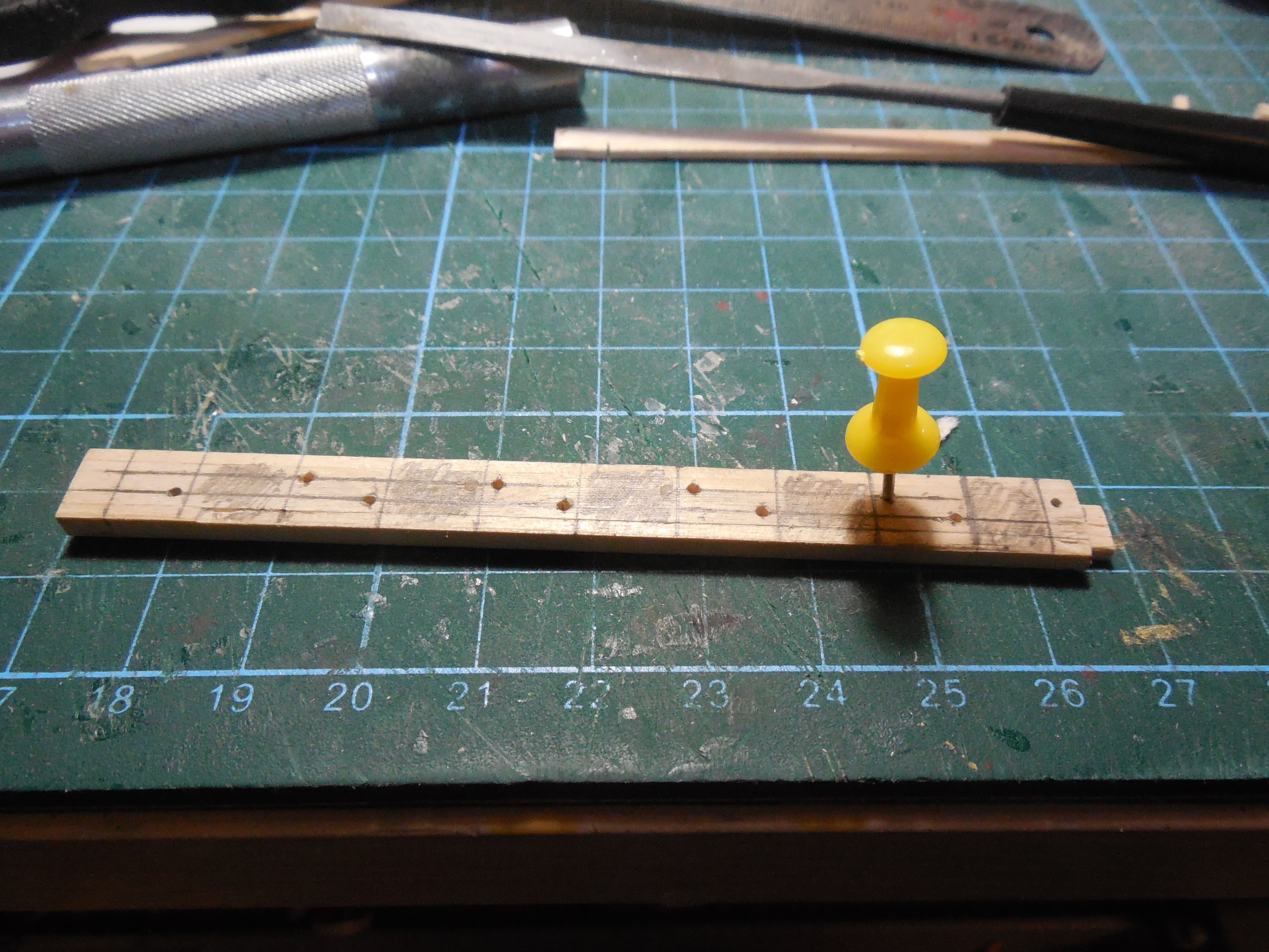 . Решил их резать в соответствии с масштабом. И вот что я получил: доски на корабле использовались 6-7 м. В масштабе это будет 86 - 100 мм. Я выбрал 93 мм. Далее для гвоздевания надо прикинуть толщину настоящих шпангоутов. Толщина шпангоутов примерно равна расстоянию между ними. А вот расстояние между ними - приблизительно равно ширине пушечного порта. Ну я взял 9,5 мм, чтобы на доске равномерно распределить гвозди.