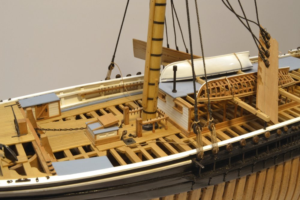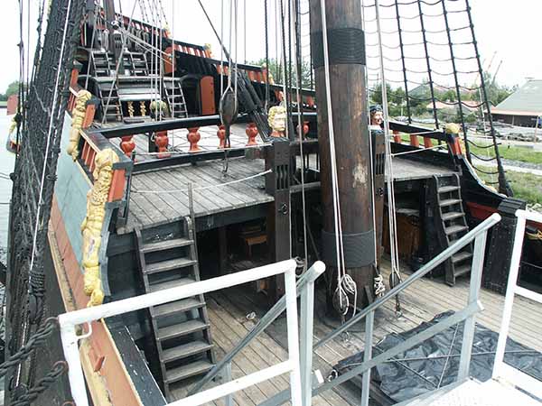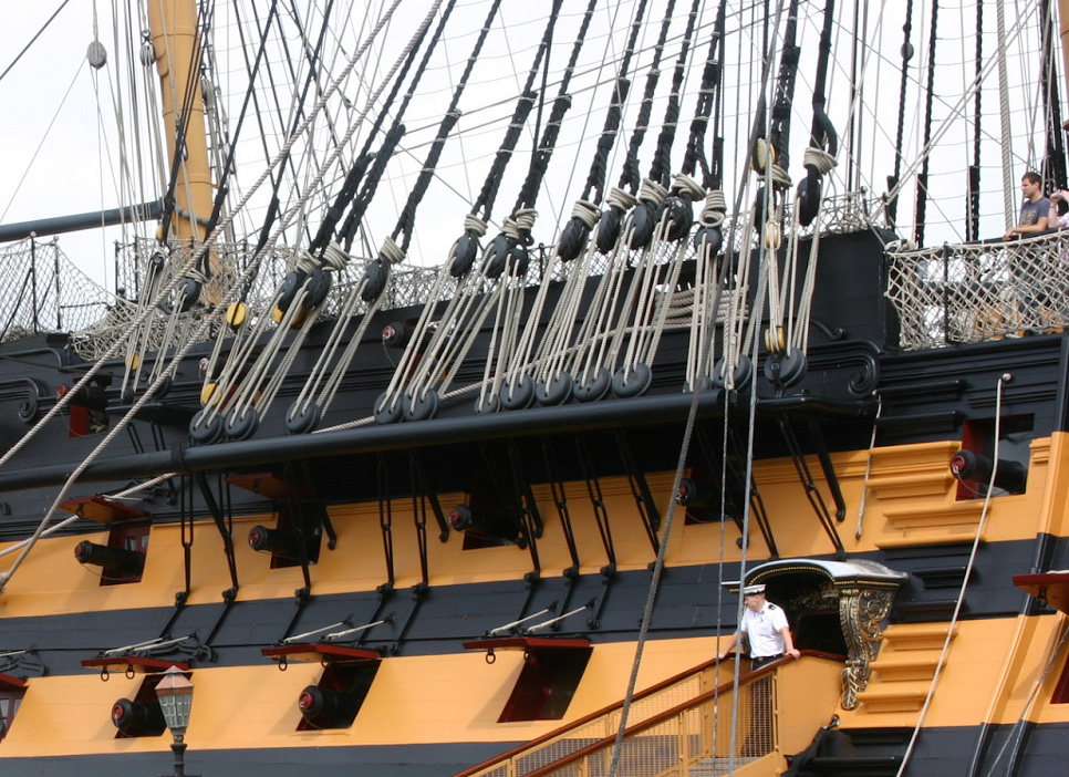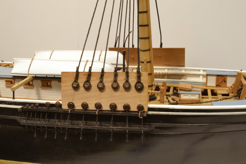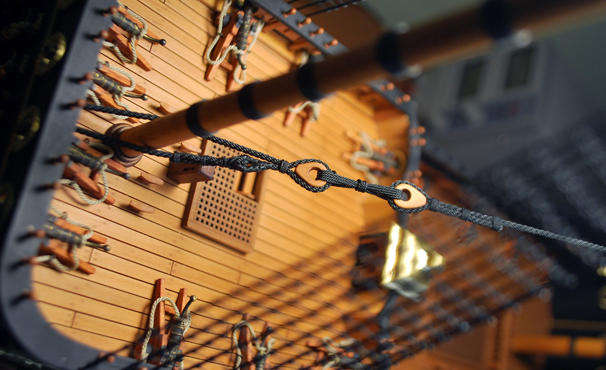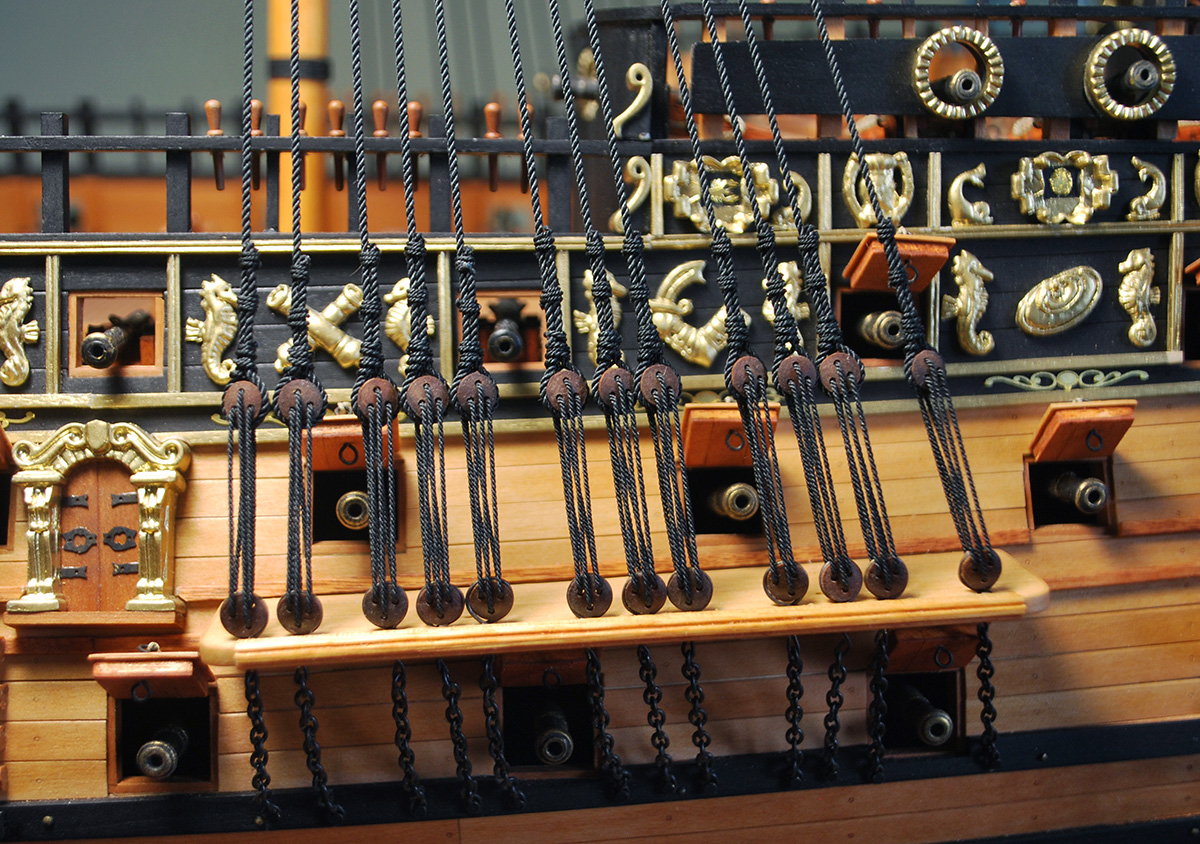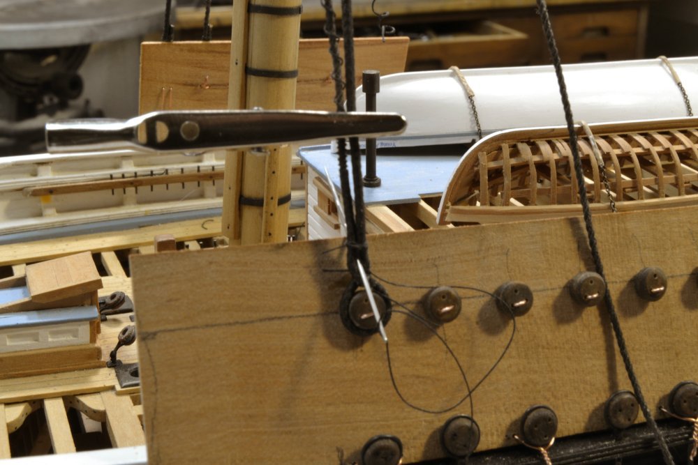 Я добавил две ванты к журнальному проекту без увеличения длины русленя. Конечно им там немного тесно и на порты они находят. Я сделал попытку их расставить, но вышло не совсем удачно. Из четырех пушек попавших на ванты одна все же смотрит прям в них. Увы, не учел большой наклон, надо было нитку протянуть при разметке.