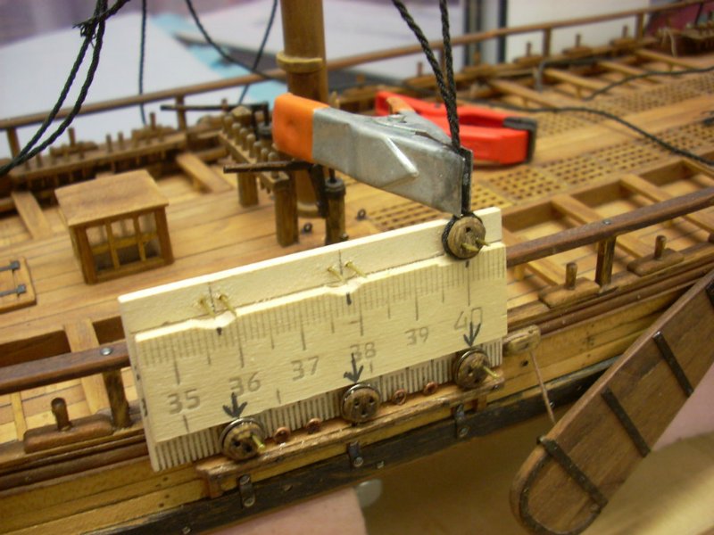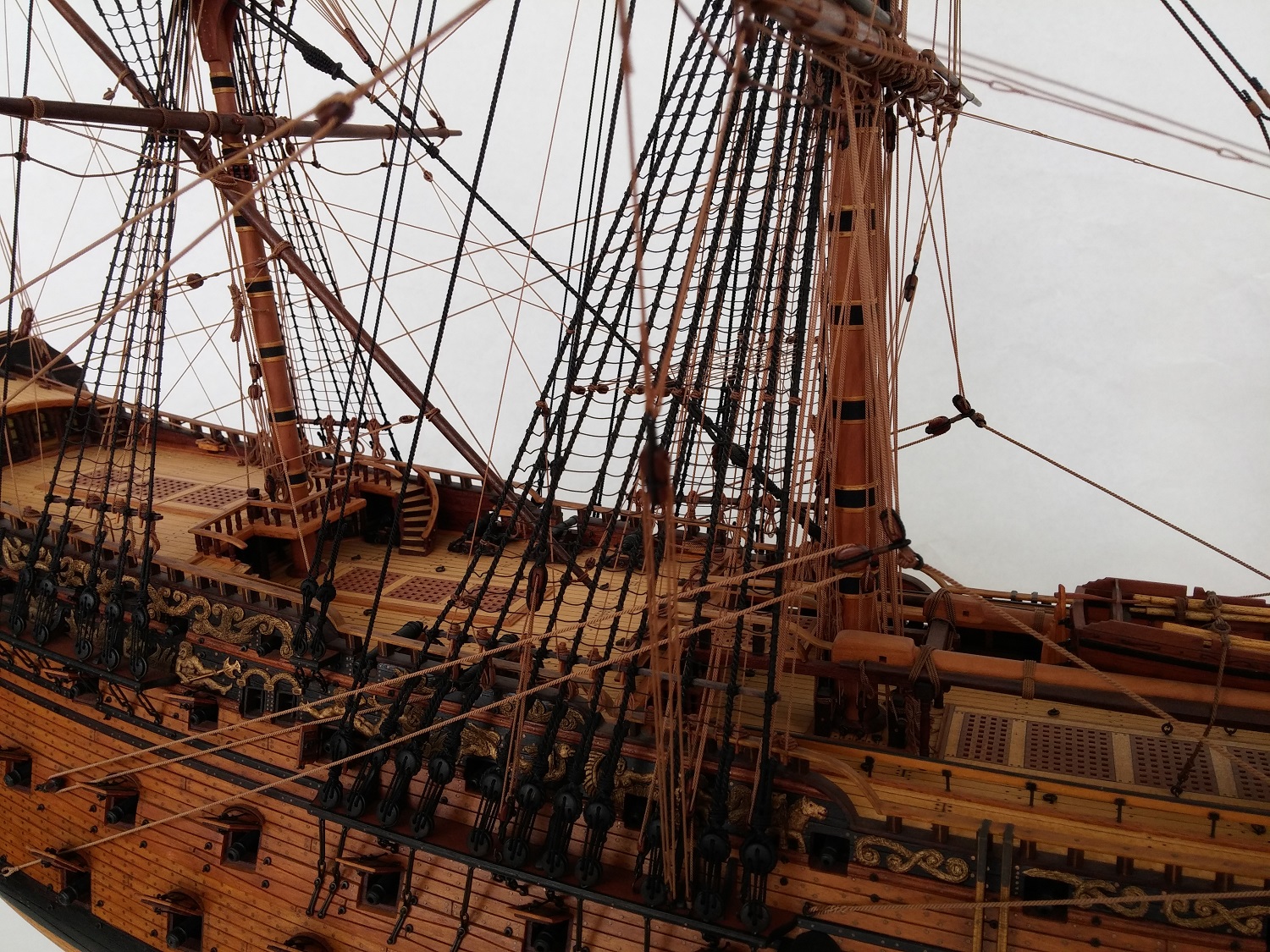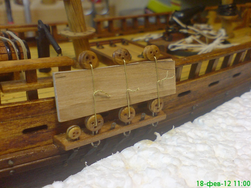 В час по чайной ложке, но все таки движение вперед имеется. Для меня этот корабль "кошка", на которой можно тренироваться. Такелаж делаю в первый раз, не все выходит чисто и красиво. Связал ванты фок-мачты, не понравились узлы, крупноваты, срезал, уменьшил диаметр выбленок и начал заново. Сегодня поставил грота-штаг 1.6 мм, самый толстый канат на корабле не считая якорного. Обтянул штаг-блоками, хотя исторично было бы поставить пятиочковые юферсы, но их еще делать надо. А штаг-блоки уже лежали вырезанные из груши, жалко.