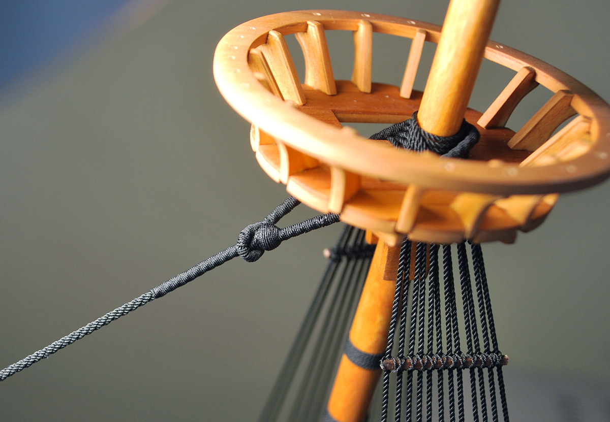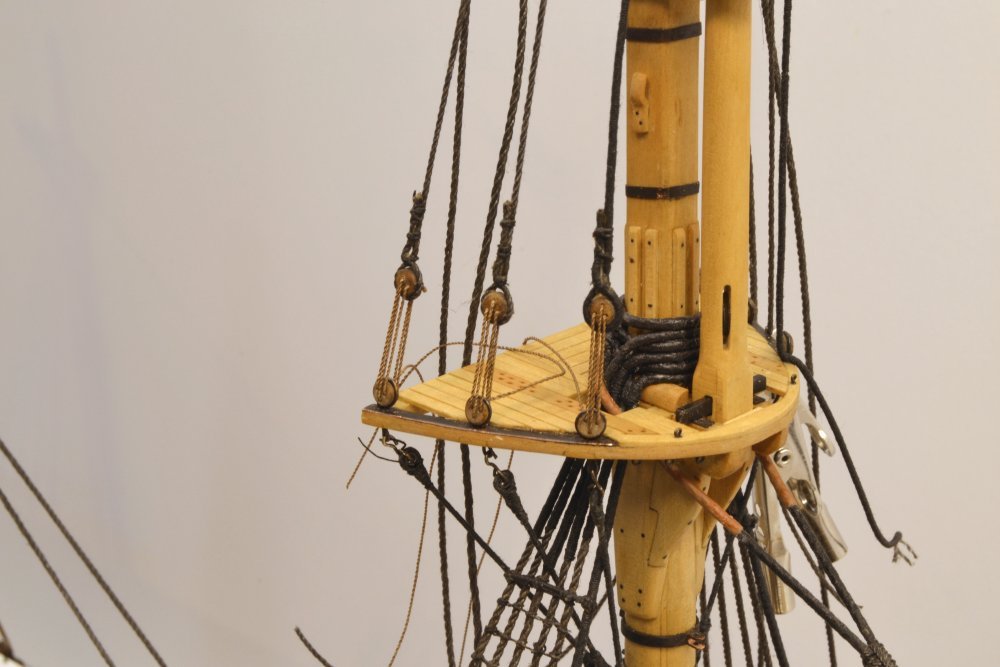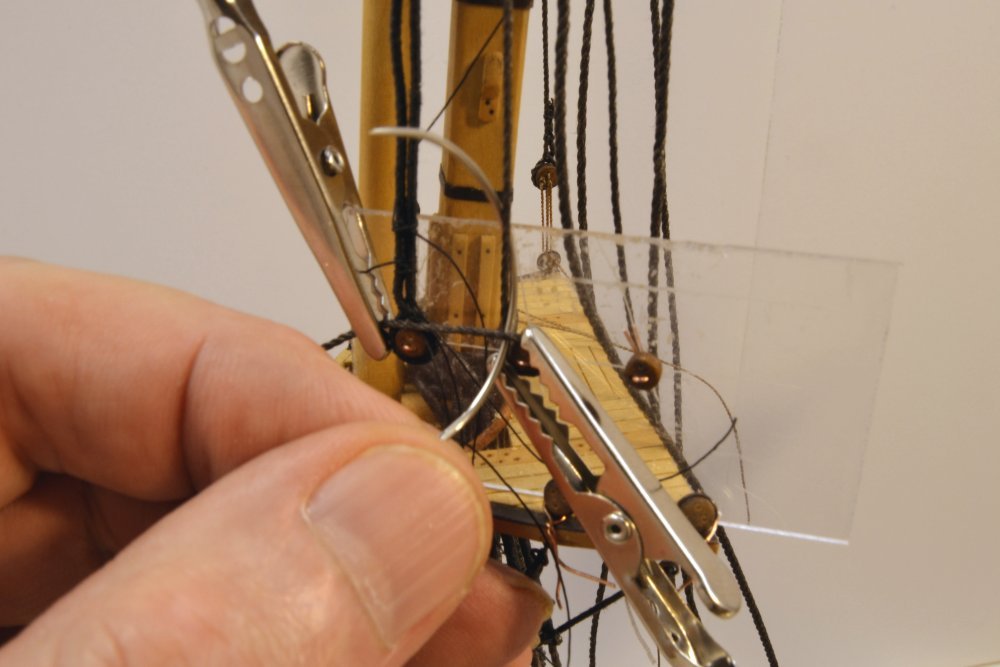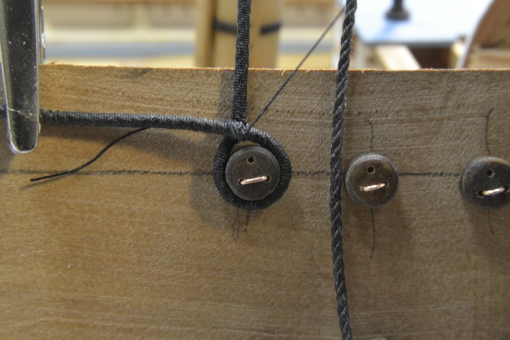 В нашем масштабе сделать плетеный мусинг почти нереально, поэтому сделал имитацию мусинга, оклетневал петлю грота-штага.