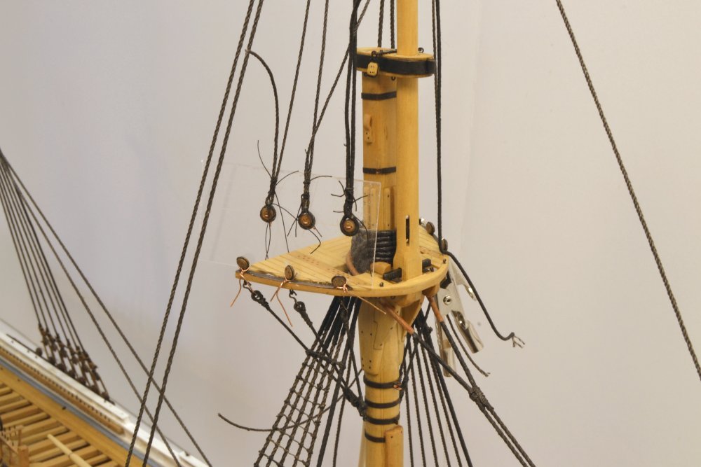 Обтяжка талями юферсов вант грот-мачты. Число вант увеличено относительно журнала. Лата над юферсами, которая в журнале названа ворстом, не ставилась. Это изобретение более позднего времени.