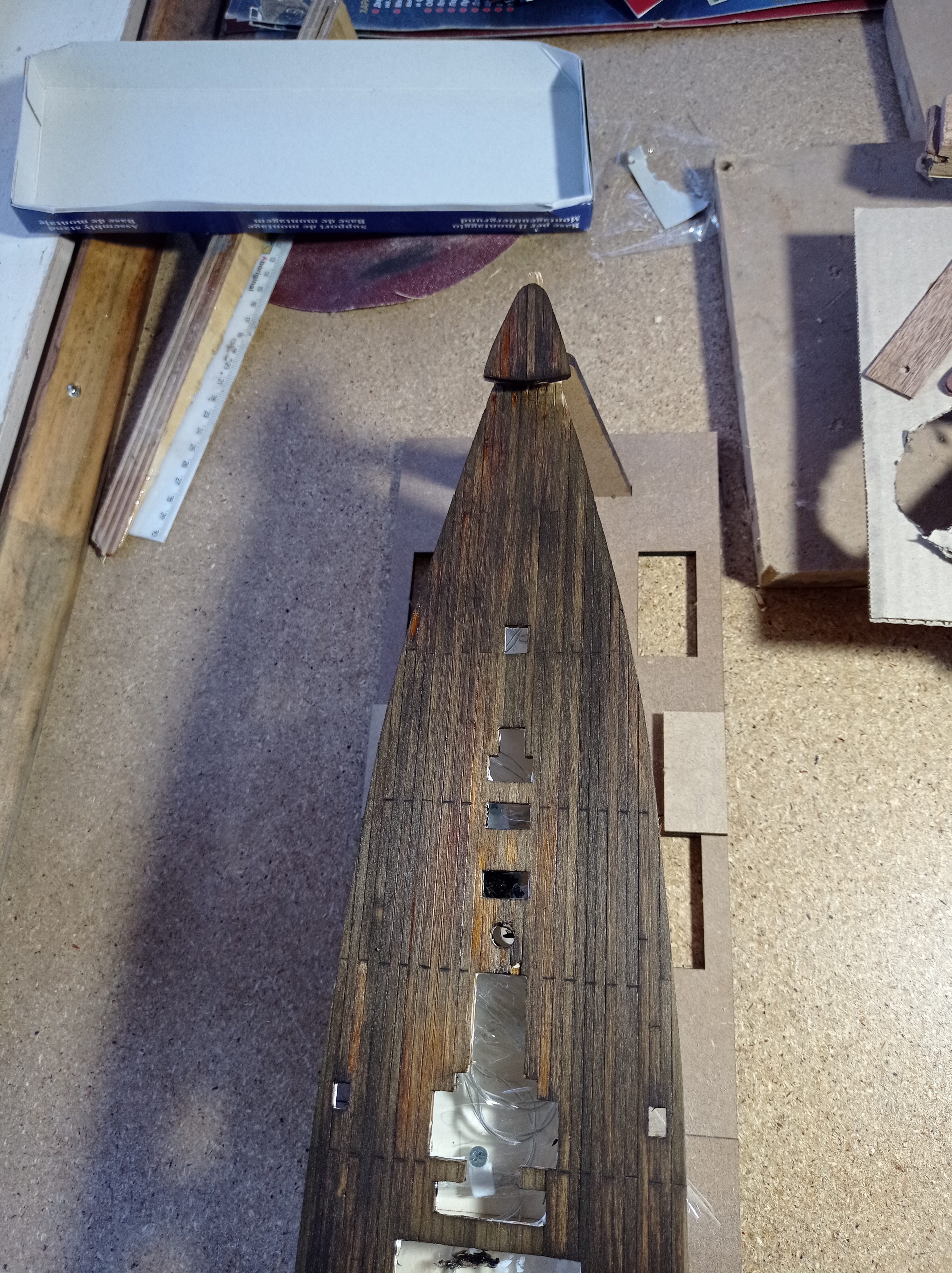 Планки палубного настила начал укладывать в шахматном порядке, но впоследствии пришёл к выводу, что лучше смотрится настил, когда стыки идут вразнобой, как на корме. Учту при постройке следующего кораблика.