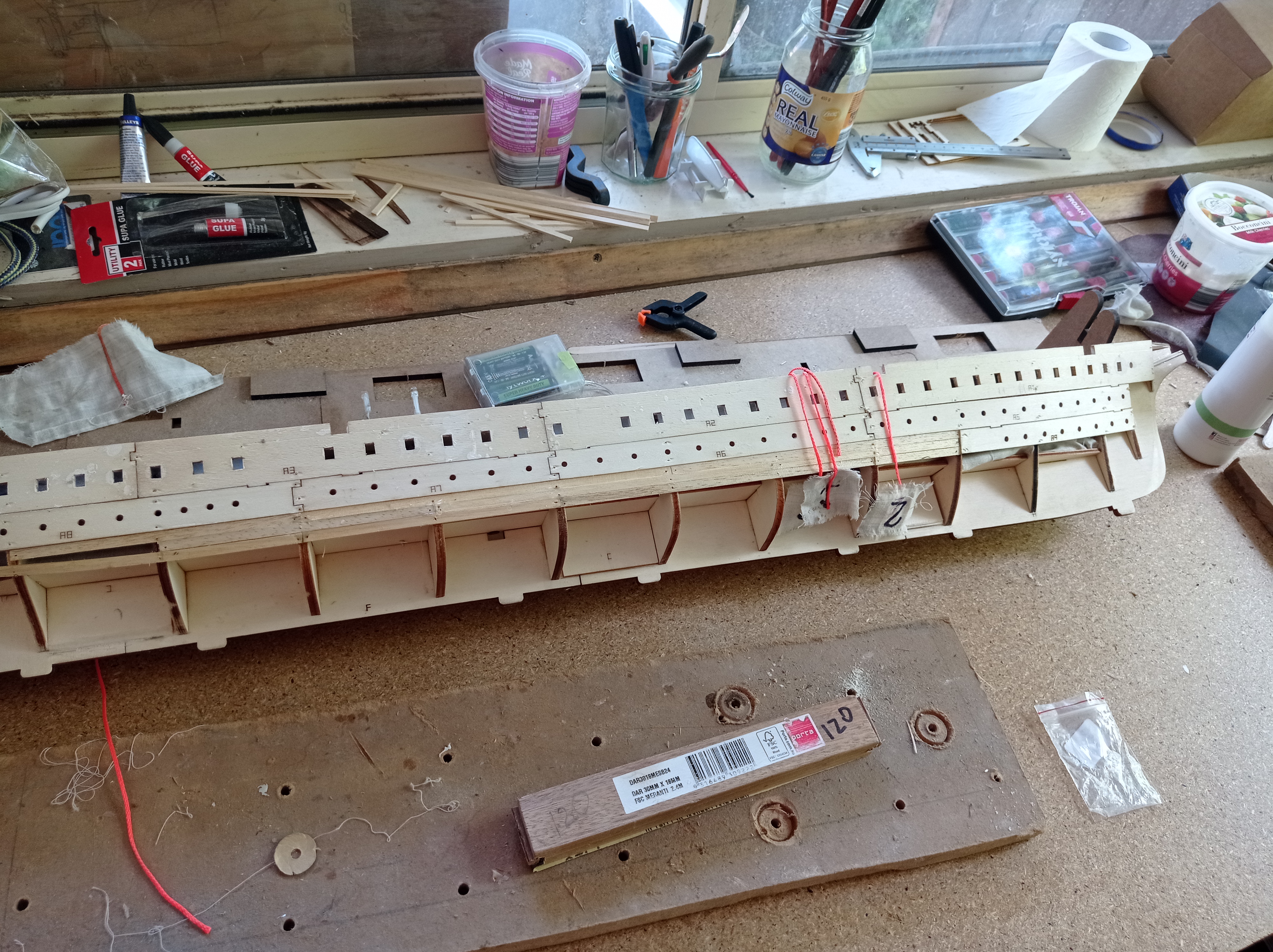 Так что я решил временно приклеить полосы ткани, которые потом выдерну сверху. В качестве клея, после многочисленных экспериментов, я остановился на клеющем карандаше. Он достаточно хорошо держит ткань, но и отрывается легко. Там, где с палубы доступа н ткани не было, к полоскам приклеил на ПВА куски верёвки. Когда надо будет, отковыряю ткань через иллюминаторы и верёвочкой вытащу.