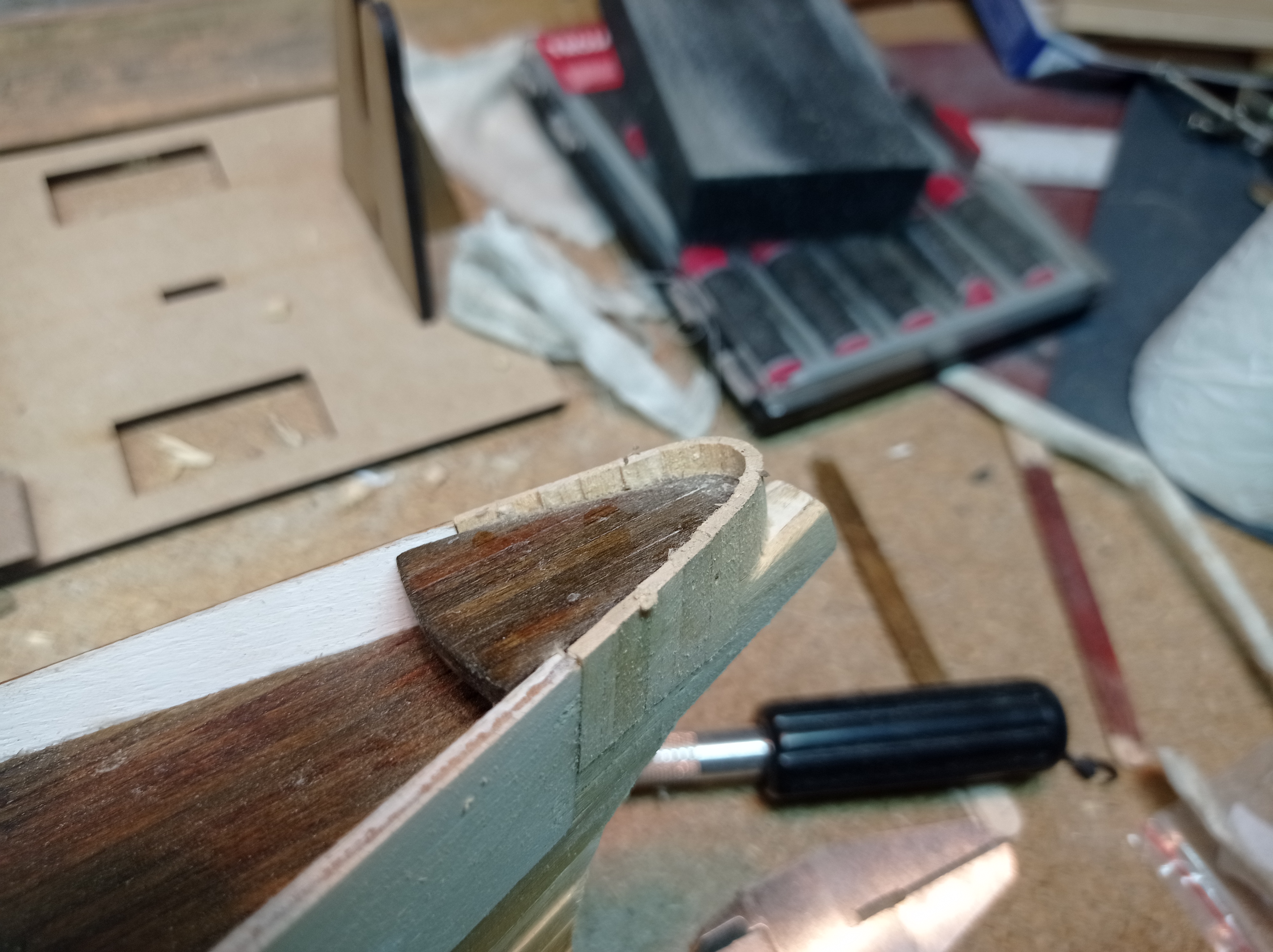 Поздновато обнаружил, что в корме, из-за сильного изгиба шпангоутов, между нижним и верхним рядами фанерной обшивки образовался зазор. Точнее, они примыкают по внутреннему краю, а по внешнему краю идёт щель. Надо было фаску снимать.