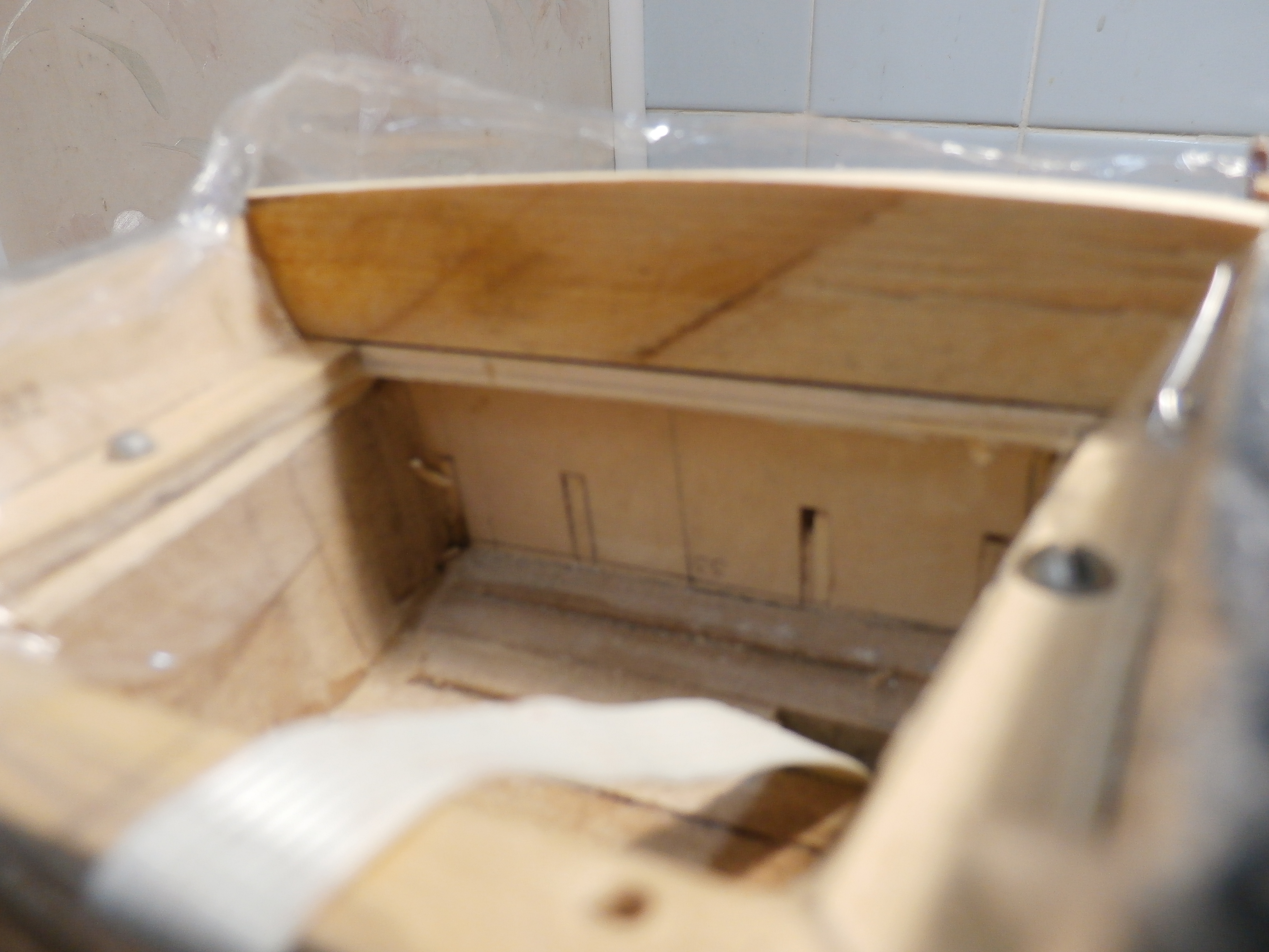 Вот и пролетело лето! Настала пора браться за модель. У меня стадия постройки на уровне корпуса модели. К весне этого года я корпус модели успел обшить чистовой обшивкой. Левый борт модели обзавелся деталировкой парусного корабля. Трапы,фордунные "скамейки",руслени и т.д. Для правого борта это всё еще в переди.Сейчас же я собираюсь обустраивать оконечность кормовой надстройки модели, заполняя её брусками из МДФ. В принципе я сторонник тяжелого корпуса модели. Тяжелый корпус, особенно крупной модели значительно понижает центр тяжести всего сооружения. Она , модель становится более устойчивой на своей подставке. ( Принцип детской игрушки - Ванька - встанька ) Я писал об этом ранее. По моему понятию корпус модели должен быть тяжелее чем весь рангоут, такелаж и паруса данной модели. Поэтому расстояние между шпангоутами ( шпации) , килевой рамкой силового набора корпуса до обшивки, я заполнял в своё время брусками хорошо просушенной горной ели. Так же я поступлю с заполнением пустоты в кормовом отсеке модели. Что бы избавить модель от лишней строительной грязи, корпус я обмотал тонкой пищевой пленкой.