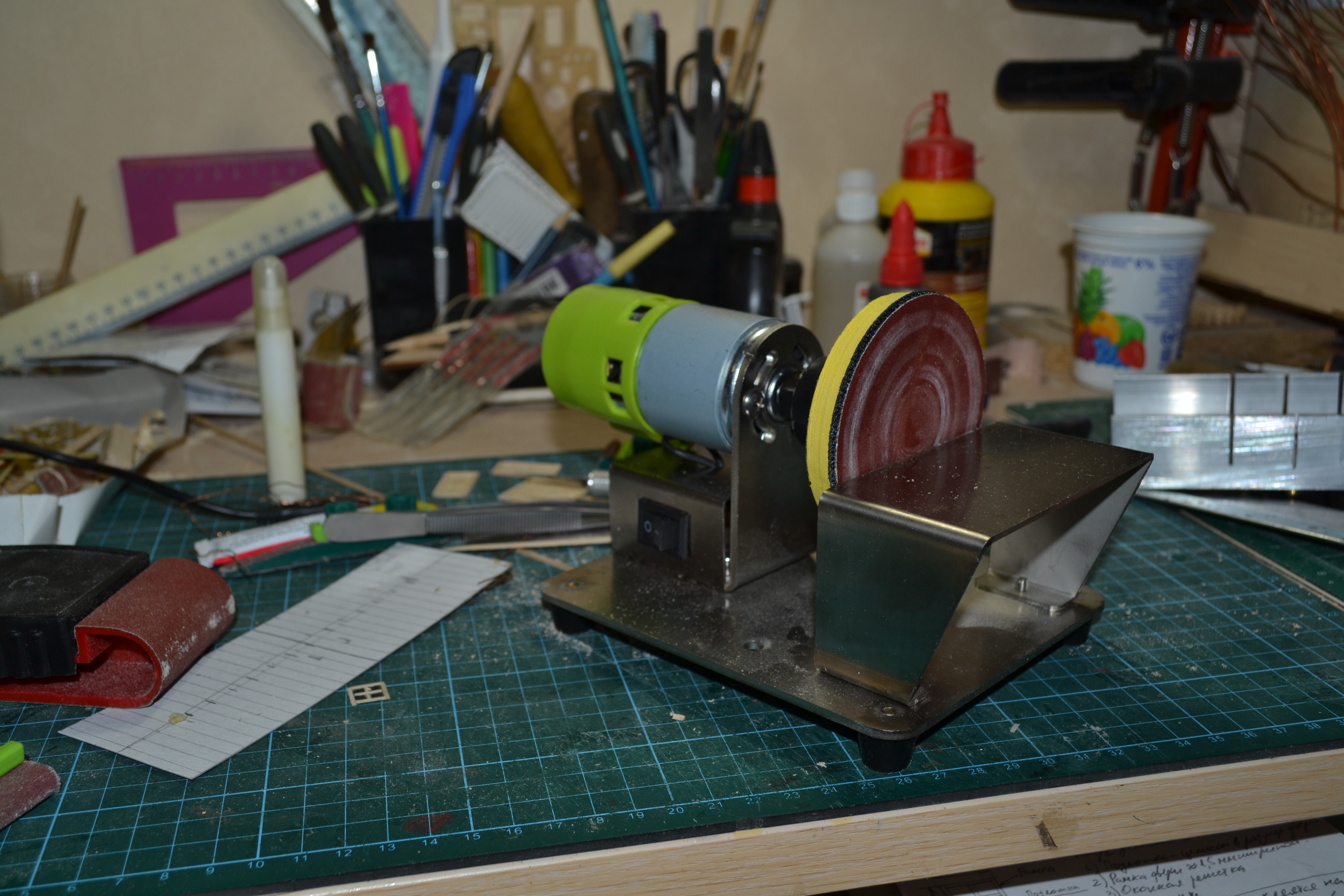 У меня есть уже 2 шлифовалки. Самодельная побольше и маленькая китайская. Есть еще совсем малюсенькая из набора станочков. Но она дерьмовенькая. Не советую приобретать такой набор - деньги на ветер