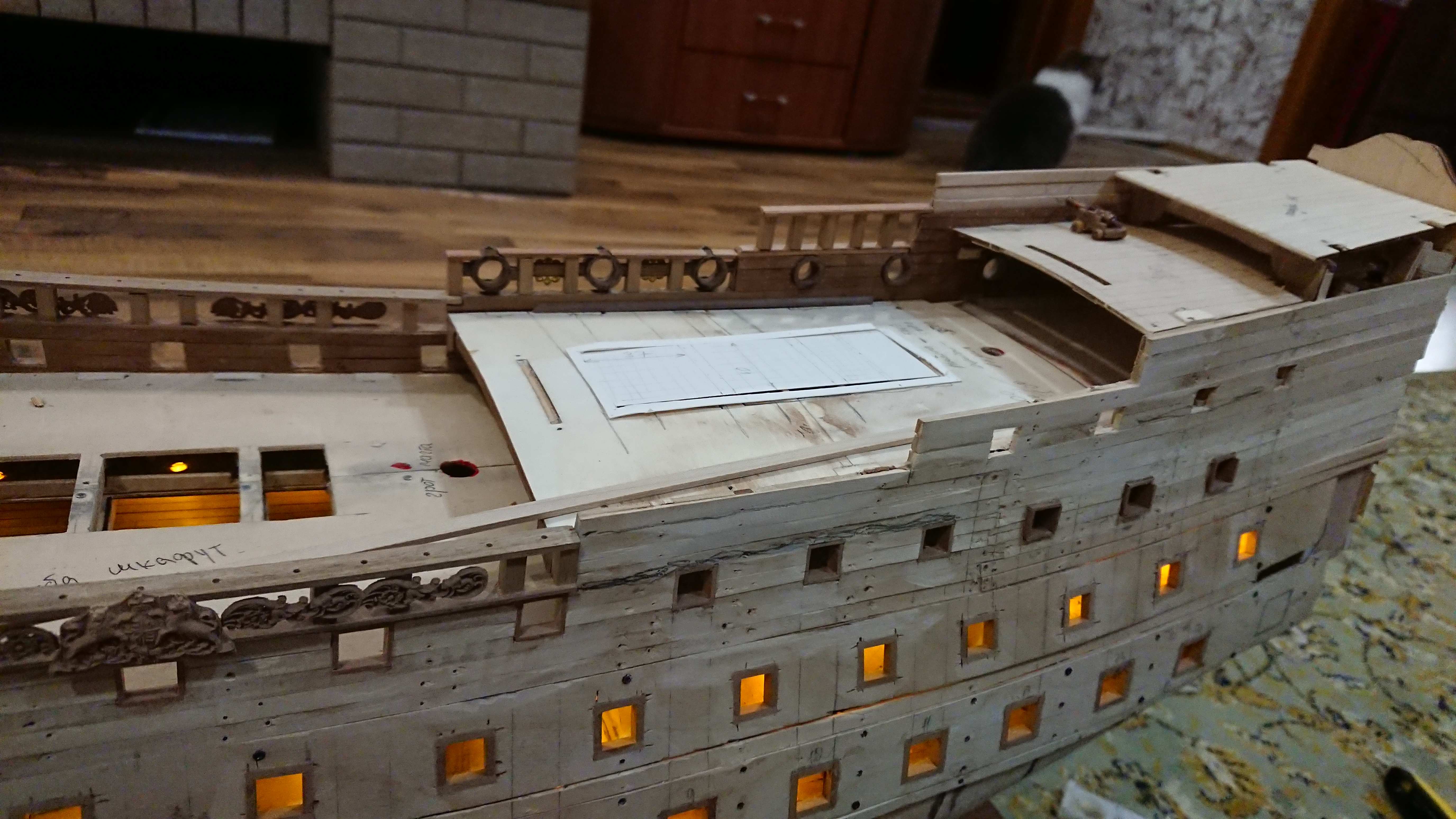 Дополнительная подсветка кормовым участком палубы – ют; надстройка над ним – полуют. Внутри этой надстройки традиционно располагались каюты начальствующего состава. Подсветка простая 6 светодиодов 12в и две литевые батарейки (таблетки).