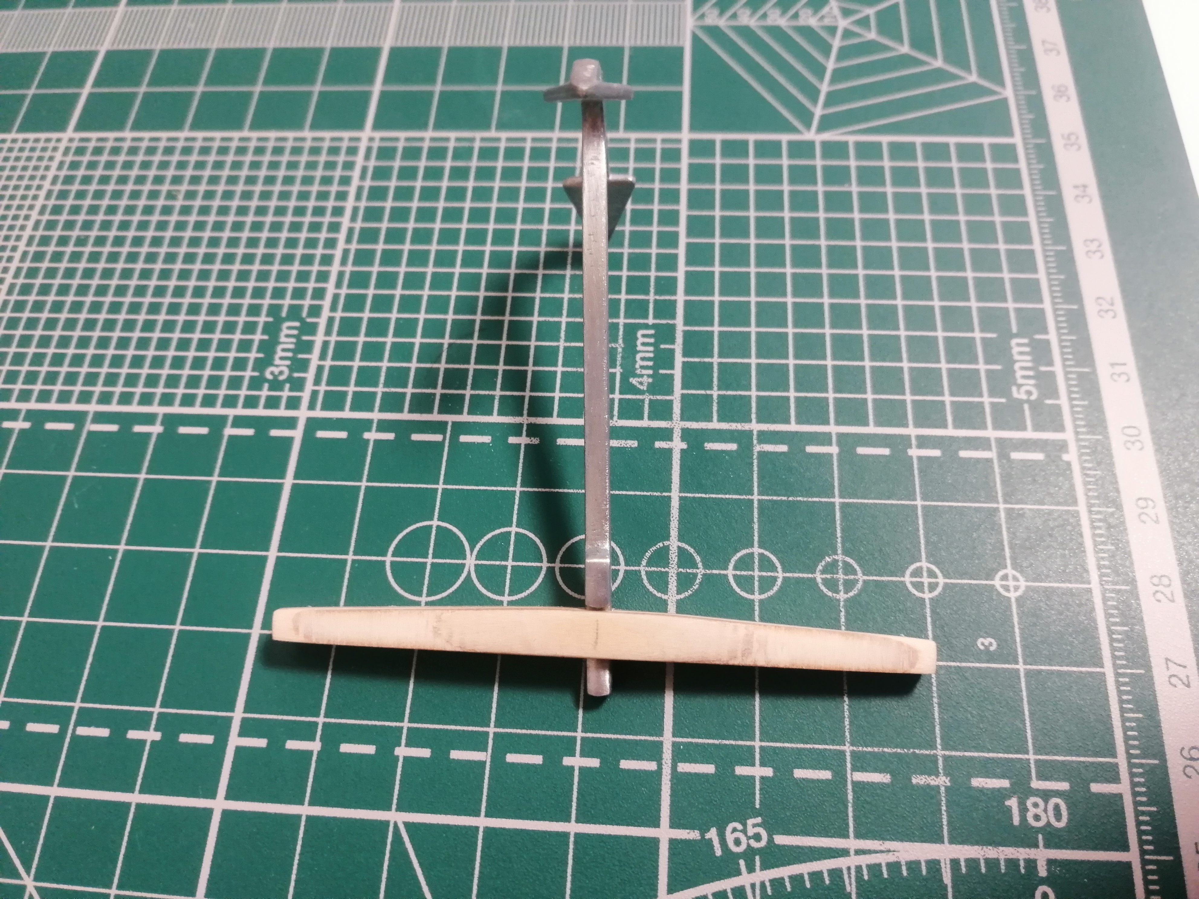 Пробегая мимо я заметил не большой недочет в якоре вашей модели. Верхняя плоскость перекладины якоря (шток) должна быть сугубо горизонтальная, а нижняя плоскость штока скошена от центра к краям.