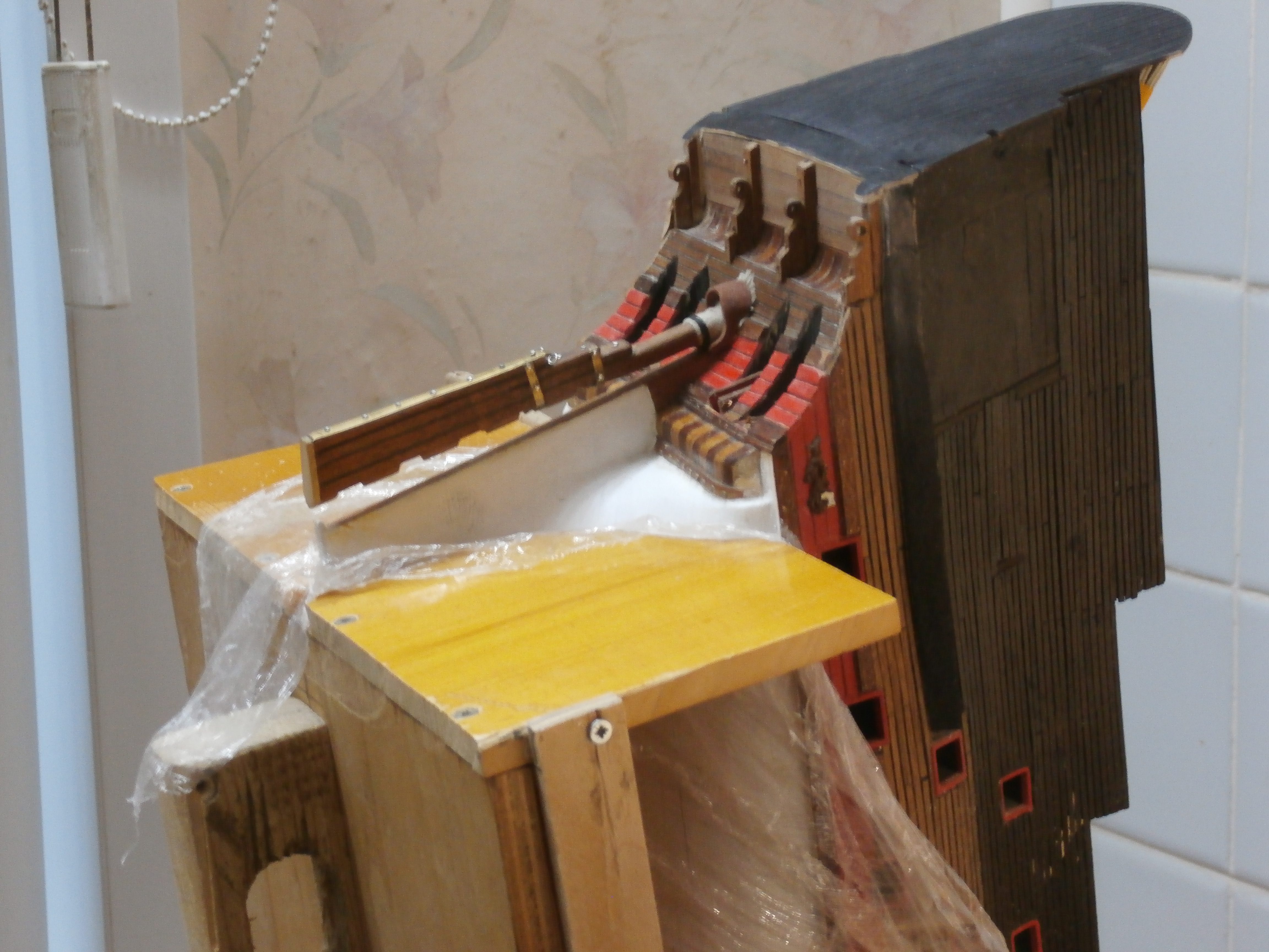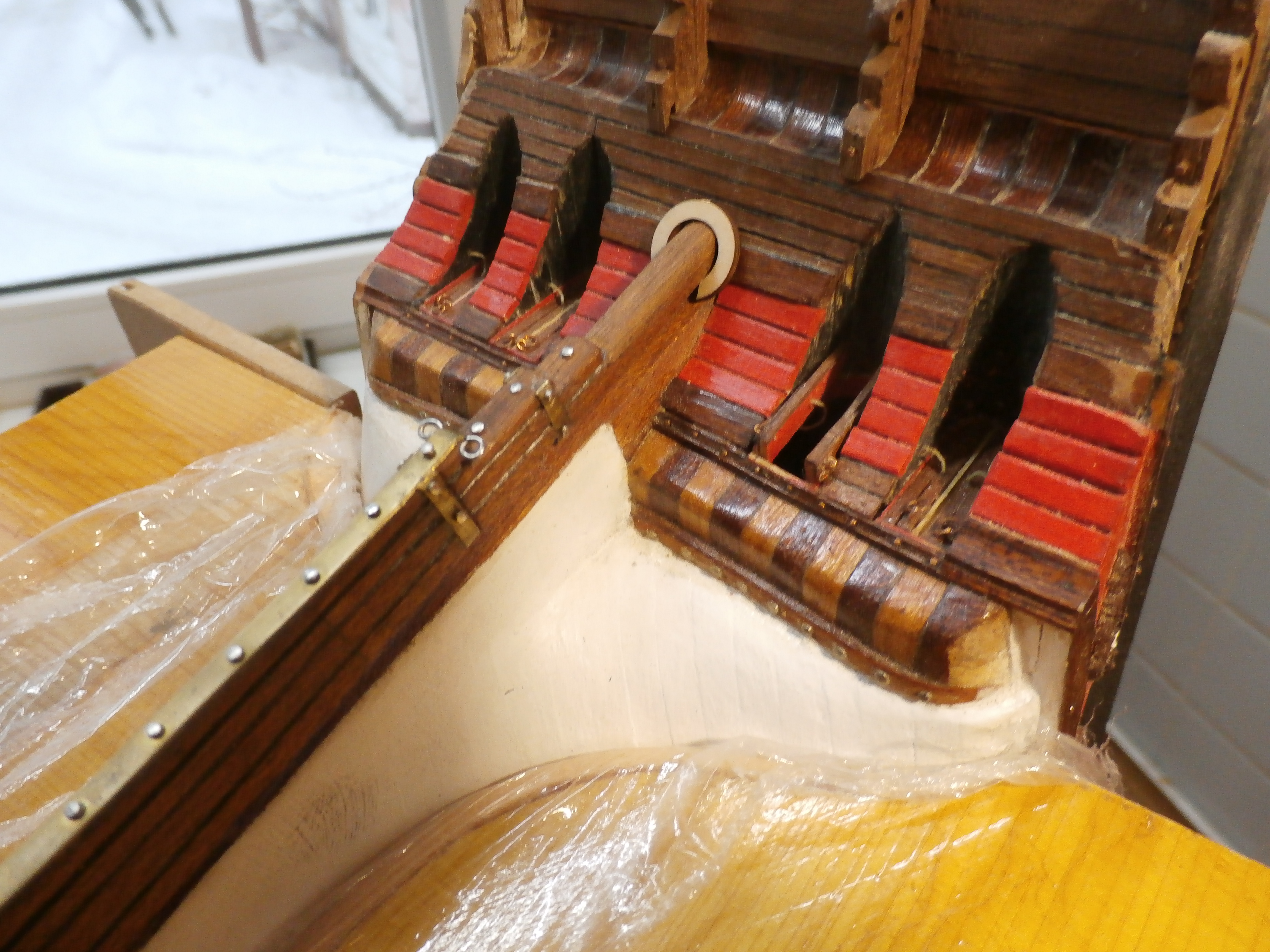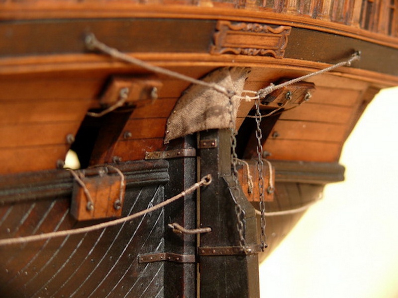 У Вас же есть книга Джона МакКейя. И я понимаю, что есть моменты с которыми, может быть, сложно согласиться с этим автором, но что относительно устройства руля там всё понятно и логично.Вы предлагаете эту фотографию в качестве примера. Но на фото модель французкого 74-х пушечного линейного корабля, построенного мастером Дмитрием Шевелёвым. Корабль этот относиться к концу XVIII века постройки, а мы строим корабль первой половины XVII века, который многое в своей конструкции взял от своих предшественников, галеонов. Румпель выходит сразу под кормовым подзором, таким образом он виден у входа в гельмпорт. А у корабля на фотографии уже и штурвал имеется, это уже другая эпоха и другая технология судостроения. Думаю пример с этим кораблём не очень корректен, в свете истории относительно с "Повелителем Морей".