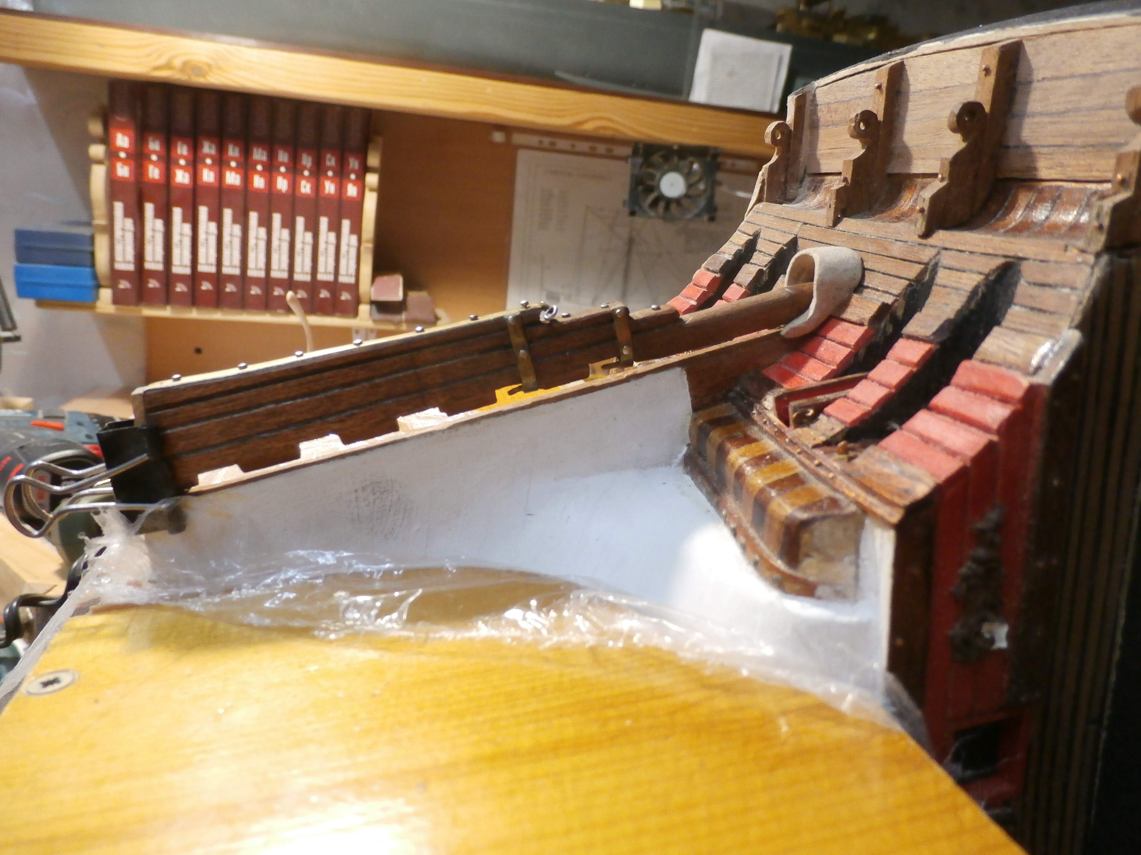 У Вас же есть книга Джона МакКейя. И я понимаю, что есть моменты с которыми, может быть, сложно согласиться с этим автором, но что относительно устройства руля там всё понятно и логично.Вы предлагаете эту фотографию в качестве примера. Но на фото модель французкого 74-х пушечного линейного корабля, построенного мастером Дмитрием Шевелёвым. Корабль этот относиться к концу XVIII века постройки, а мы строим корабль первой половины XVII века, который многое в своей конструкции взял от своих предшественников, галеонов. Румпель выходит сразу под кормовым подзором, таким образом он виден у входа в гельмпорт. А у корабля на фотографии уже и штурвал имеется, это уже другая эпоха и другая технология судостроения. Думаю пример с этим кораблём не очень корректен, в свете истории относительно с "Повелителем Морей".