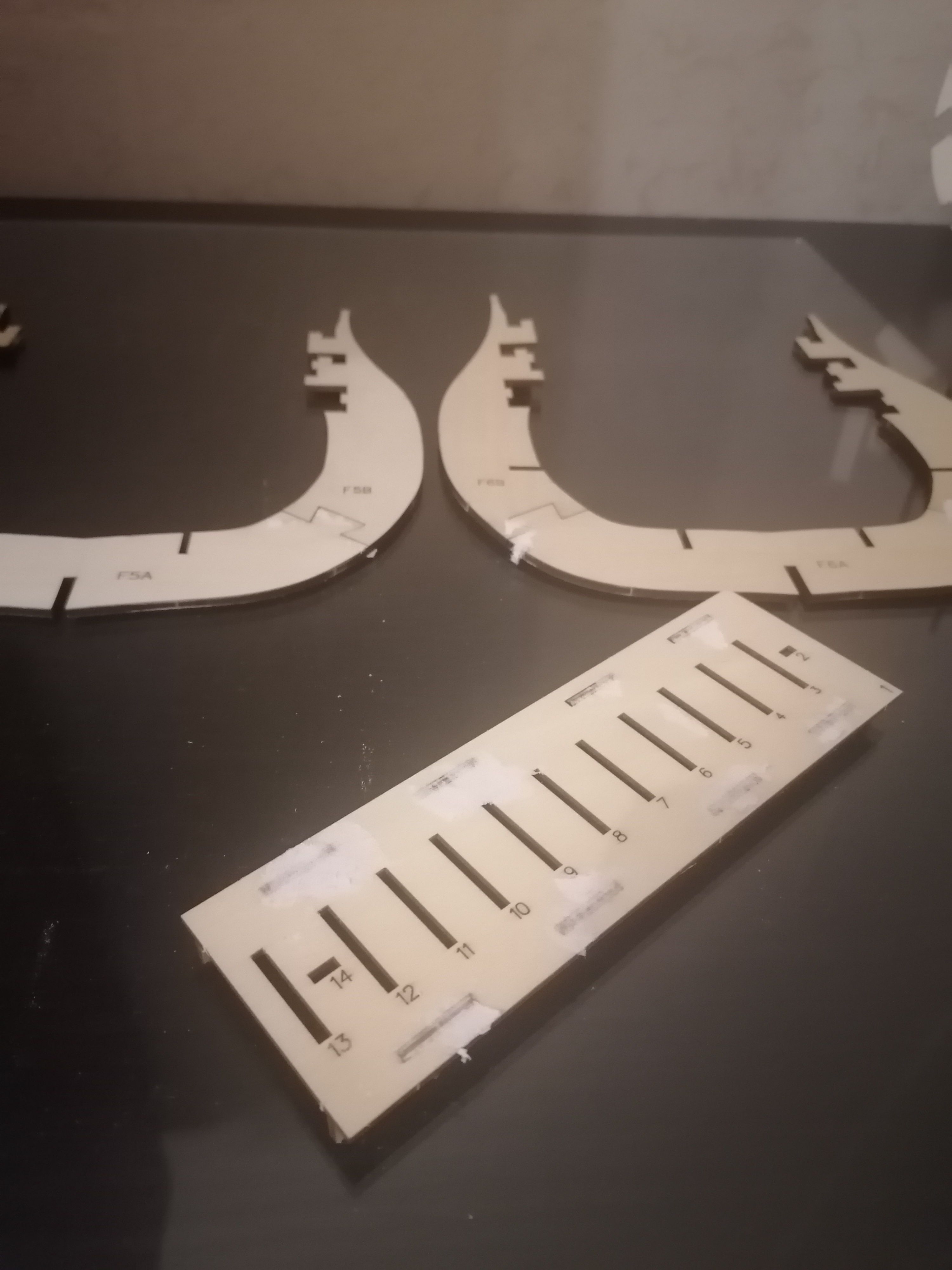Добрый день. Просматривал все ответы, но не было времени написать. Да и кроме благодарности за отзывчивость писать особо нечего. Спасибо всем за советы и ссылки, как говорится в споре рождается истина. Поэтому ещё раз перечитав и переварив всю информацию к решению приду. За это время подойти к кораблю получилось один раз на пару часиков. Итог: шпангоуты из второй посылки под прессом, стапель для шлюпки склеили и лафет пушки.