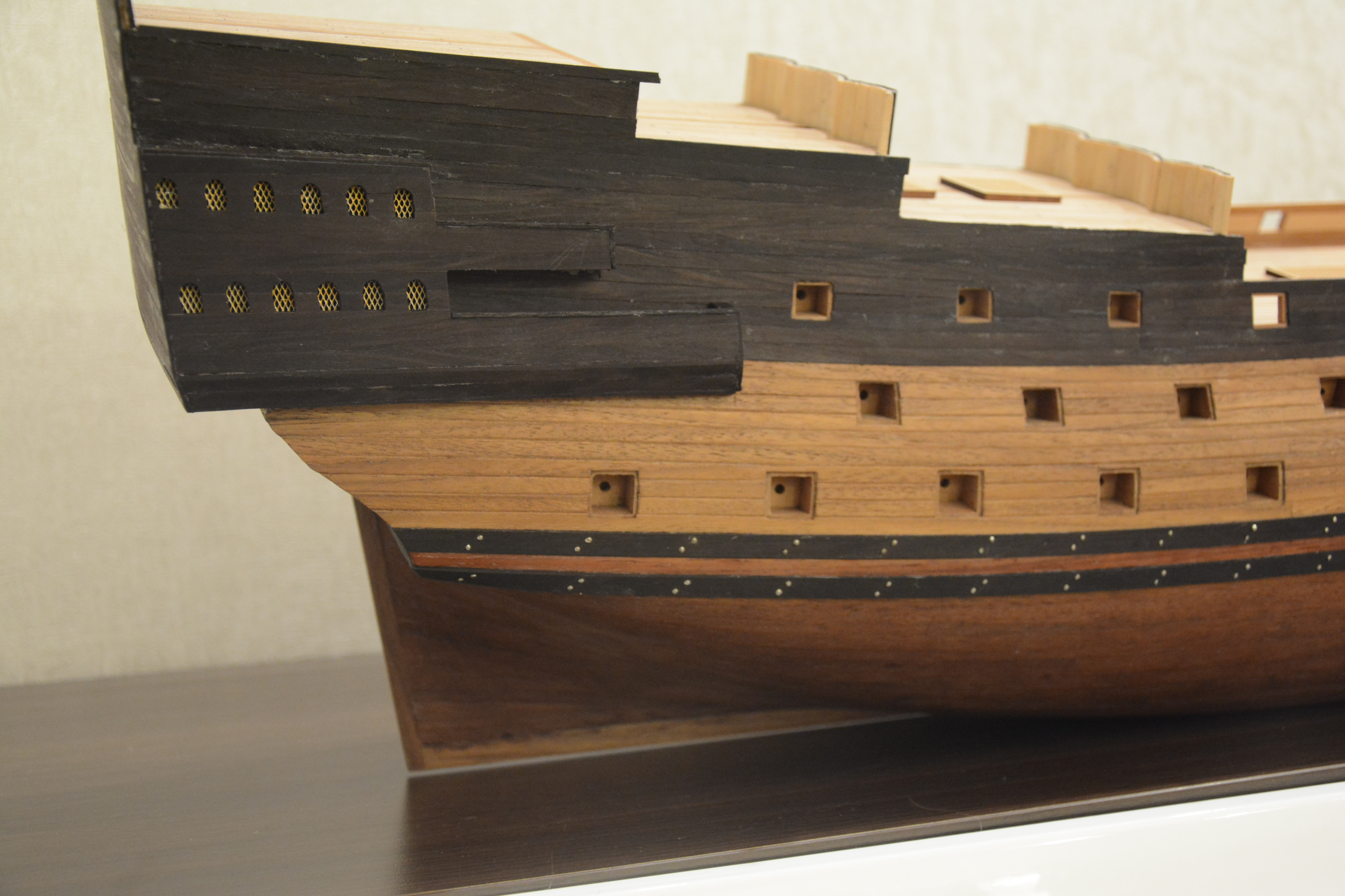 Буду делать чертёж и выпиливать по нормальному. Карронады (гаубицы) на верхней открытой палубе будут. Хочется эстетики, а не килограмм акрила, чтобы скрыть обожженные лазером уши. Морилкой было-бы хорошо структуру дерева (фанеры) раскрыть