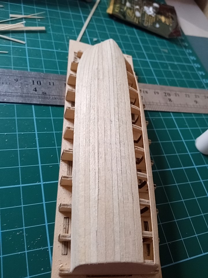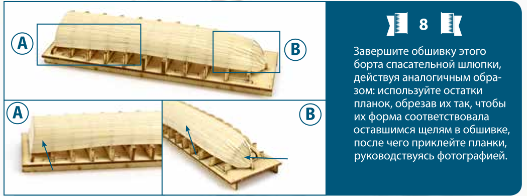 Вот я понять не могу, когда приклеивать планки носовой части шлюпки когда обрезку со стапеля выполним? Пока у меня вот так