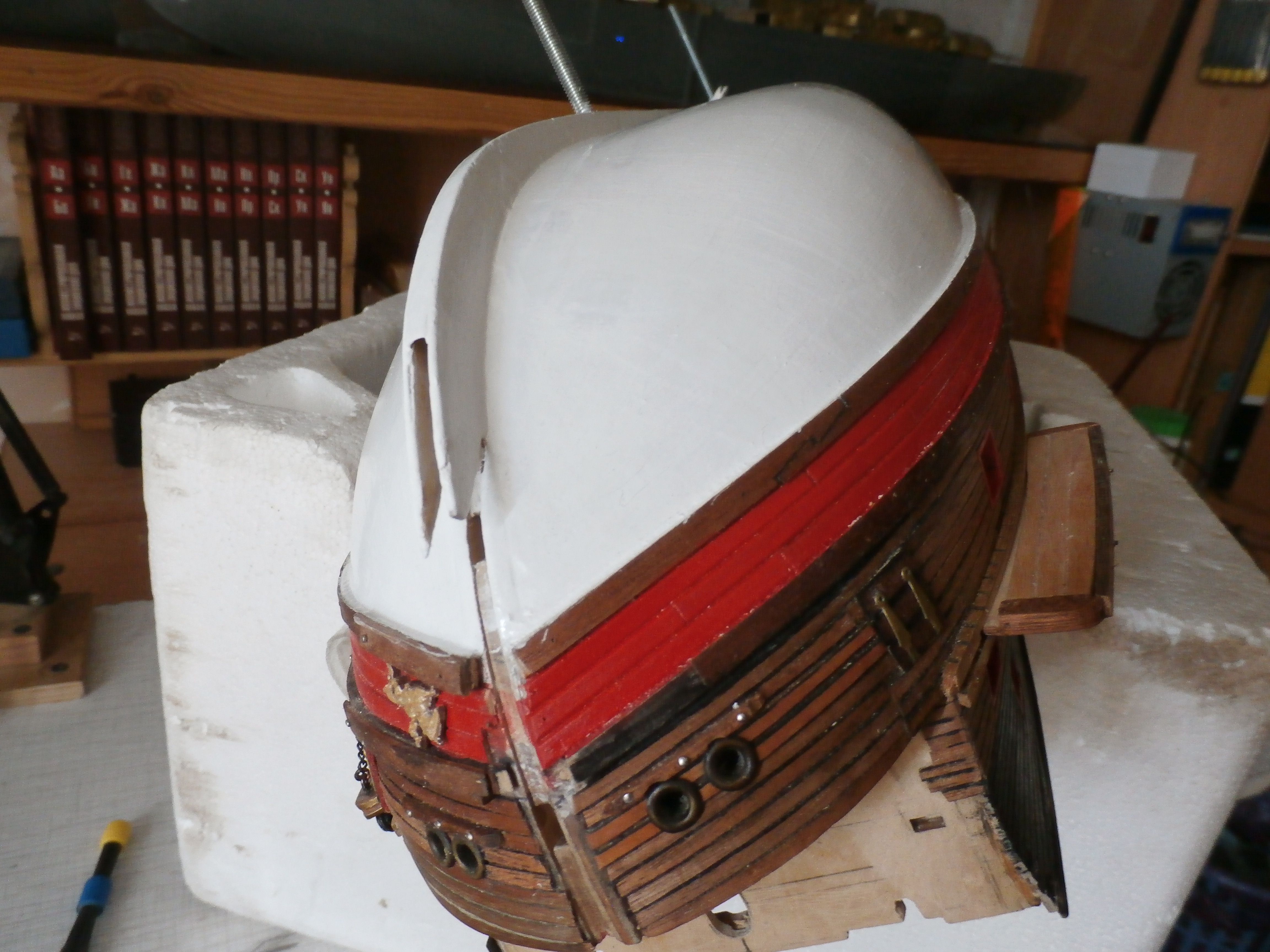 Верфь работающая на моём письменном столе продолжает свою работу. Прошло трое суток, как я покрыл последним шестым слоем акриловой белой краской борта и днище моего корабля. Пора моему кораблю , вернее корпусу модели, в её рабочее стойло, на её строительные киль-блоки. Но перед этим нужно как то обезопасить корпус модели , по крайней мере ниже ватер-линии от разных превратностей строительства: пыли, сколов и царапин и т.д.