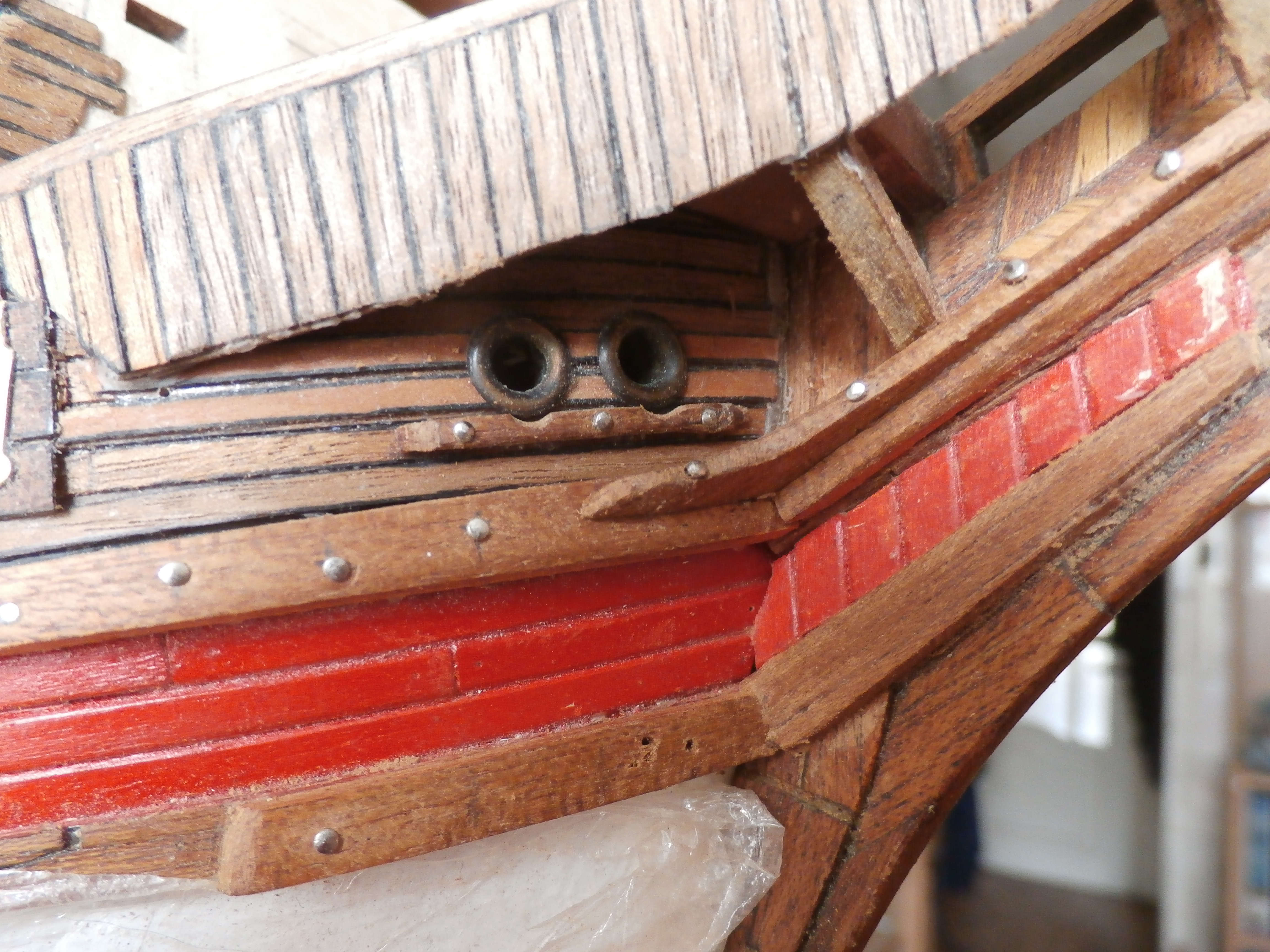 Верфь на моём рабочем столе продолжает свою работу. Ведем строительство английского парусного линейного корабля "Повелитель морей". Монтаж верхней части княвдигеда, вместе с гальюнной площадкой к корпусу модели корабля. В прошлом посте я описывал установку двух книц правого и левого борта корабля на уровне верхнего бархоута корабля. Сейчас же приступил к установке двух чикс по бортам на нижнем бархоуте модели. Монтаж чикс гальюнной площадки и кневдигеда в проекте ДеА не предусмотрены. Разработчики модели не захотели заморачиваться с дополнительными работами над моделью.