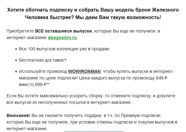 у другого издательства, под конец подписки, тоже была почти такая же тема. только там не предлагали отказываться от подписки, а наоборот ускоряли подписку и получал несколько посылок разом, включая все бонусы в виде дополнительных фигурок.