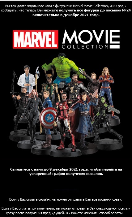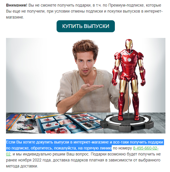 Коллекция продолжается. В первую очередь отправляем всем подписчикам, далее выпуски поступают в наш интернет-магазин. Телефон горячей линии 8-495-660-02-02, 8-800-200-02-01 (пн-пт).Максим Владиславович Ворыпаев писал(а): ↑04 апр 2022, 23:29 Мне интересно, если выпуск коллекции по железному человеку отменят, будет ли возможность вернуть деньги? Полусобранный костюм нафиг никому не нужен.