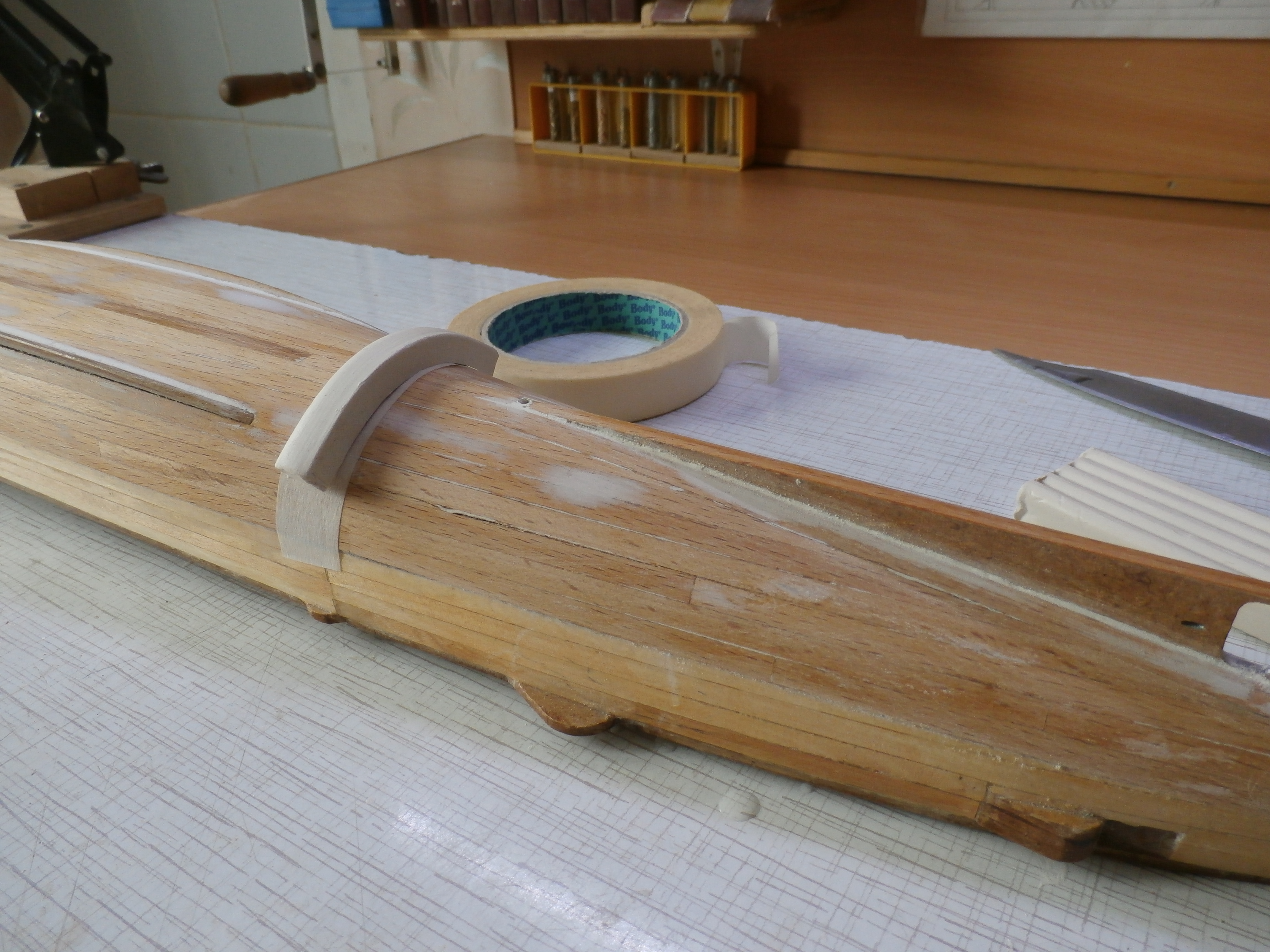 Здравствуйте Сергей Николаевич,, большое спасибо что отвечаете и помогаете советом, благодарен Вам, по Вашему совету так и буду делать с керамической массой , с одной упаковкой , прежде чем начать делать сделаю на перевернутом корпусе - Повелителя - в начале на носовой части корпуса отрежу от пищевой пленки длинную полоску шириной 30 млм и положу на корпус корабля в носовой части в обхват на правую и левую сторону и на килевую основу корабля, из одной упаковки сделаю прямую полоску шириной - 15 млм и толщиной - 3 млм постарсь сделать длиною что бы хватило на в сторону корпуса и не доведя полоску до ватерлинии - 20 млм , будут небольшой длины -полоска- соединю 2 куска полоски вместе со обой как пластелин и оставлю высыхать и затвердевать на корпусе на сутки, как на Вашей фотографии показаной - попробую в выходные сделать на кормовой части, с уважением к Вам Юра , всех благ и удачи и здоровья !