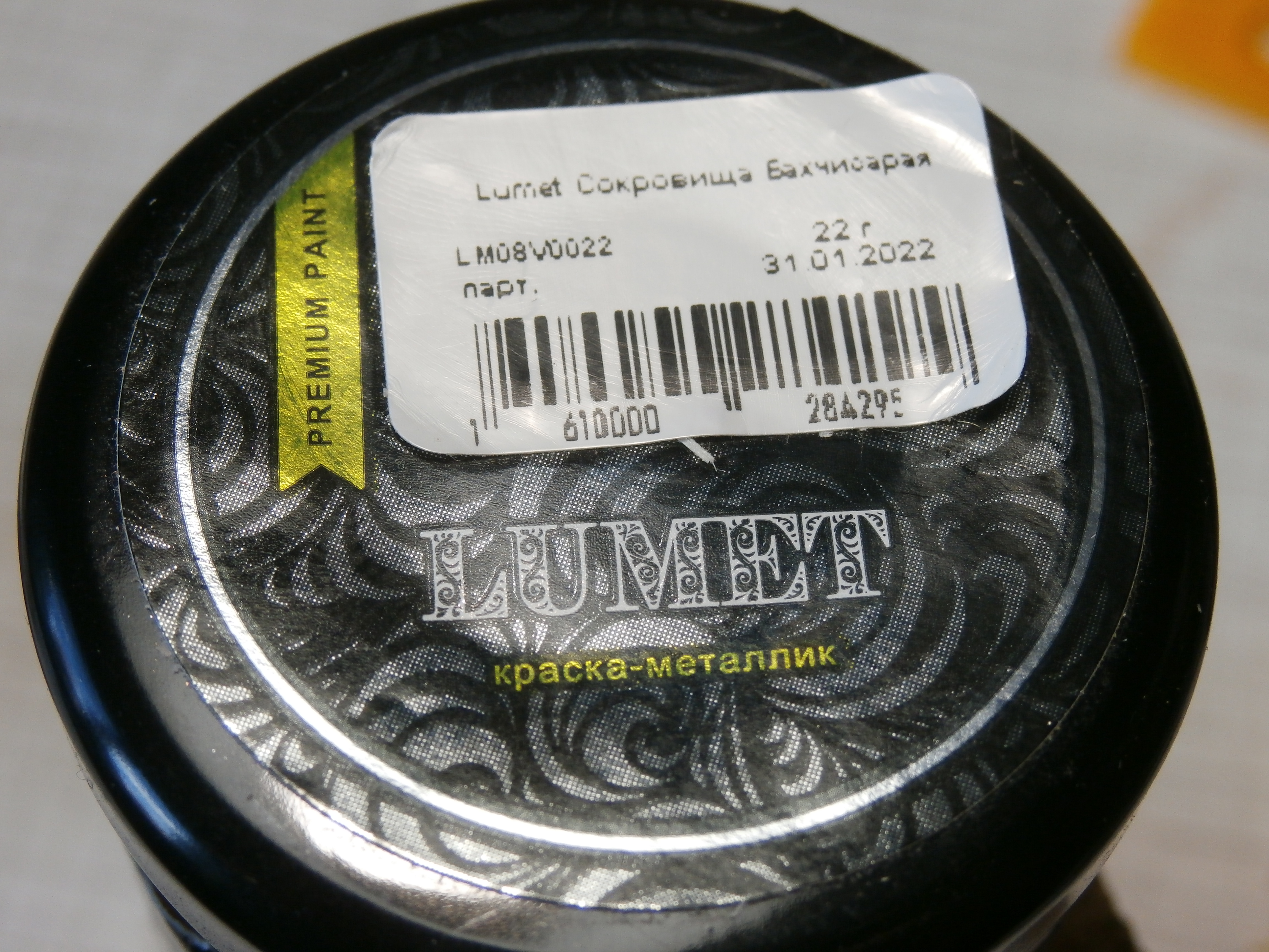 Ну во первых моя молодёжь привезла мне на ДР из Москвы Жидкую поталь. Цвет называется Lumet "Сокровища Бахчисарая" Миниатюрная баночка в 22 грамма. Поталь очень хорошо ложится на поверхность, растворена она на спиртовой основе, быстро высыхает, не прозрачна, вполне хватает одного слоя , но я пускаю по своей привычке в два слоя, получается эффект "Золота богатого".