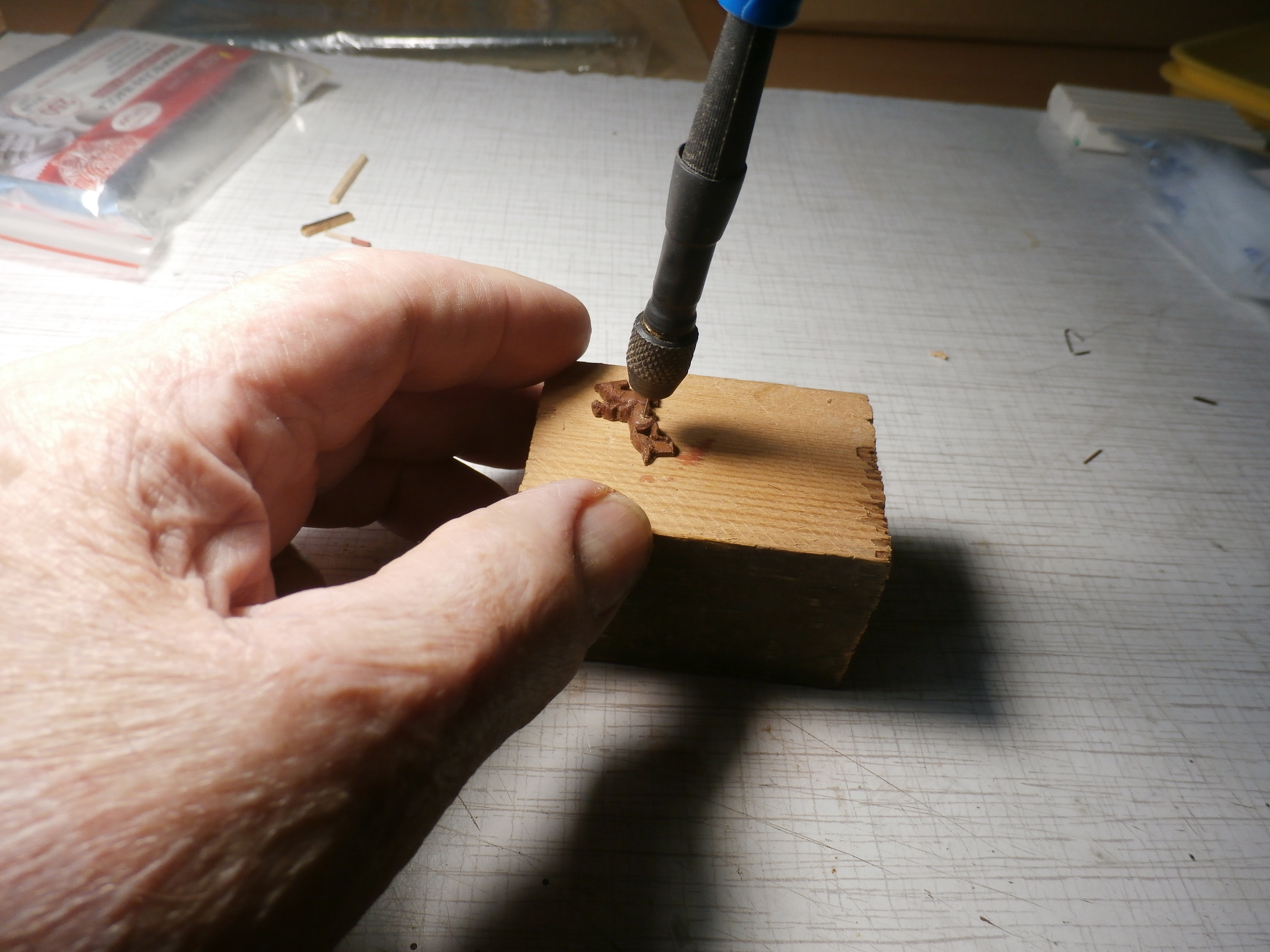 Можно было конечно декор закрепить просто на капельку клея, но я предпочитаю для надежности металлические штифты 0,5 мм. Все-же на слою краски клей держит не надежно. Будет обидно, если фигурка в будущем просто отвалится. Хотя обычно мелкие детали крепят секундным клеем, я же предпочитаю ПВА. Сложность операции заключается в просверливании отверстий на фигурках. Грушевый шпон из которого вырезана фигурка очень тонкий и сильно пересушен, по этому очень хрупок, но приноровиться с ручной сверлилкой вполне возможно, и если не спешить все пройдет удачно! Диаметр сверла 0,5 мм.