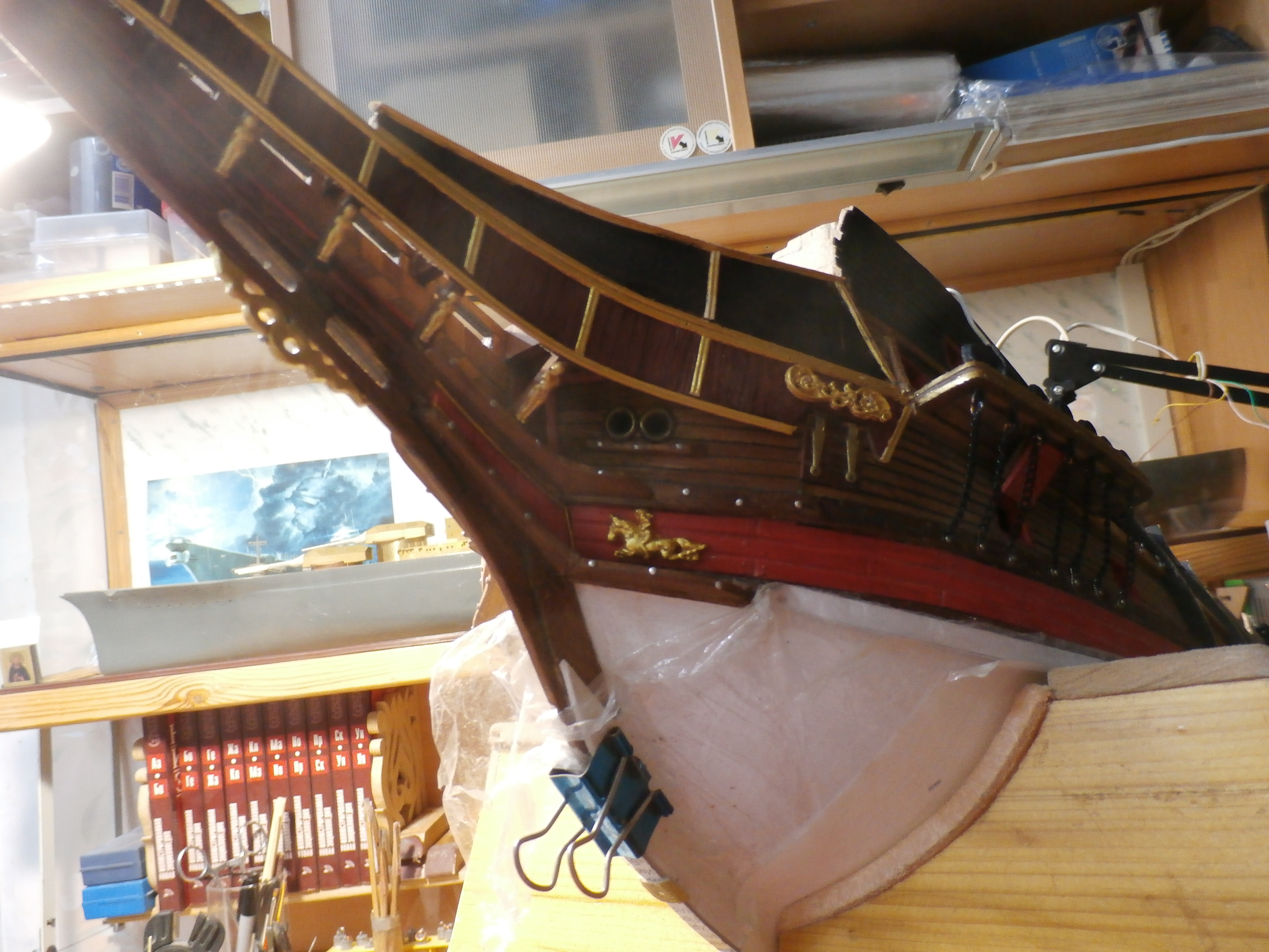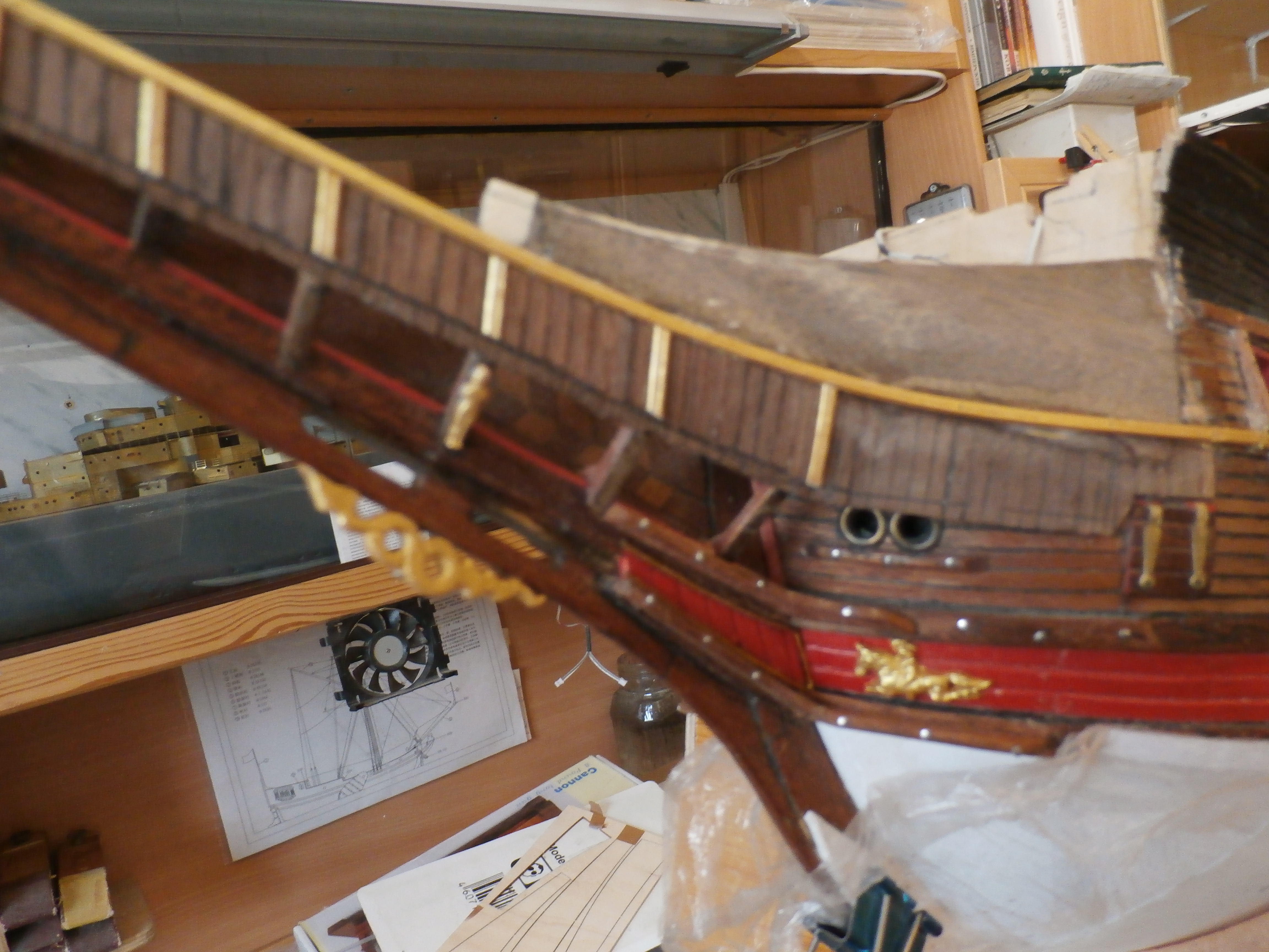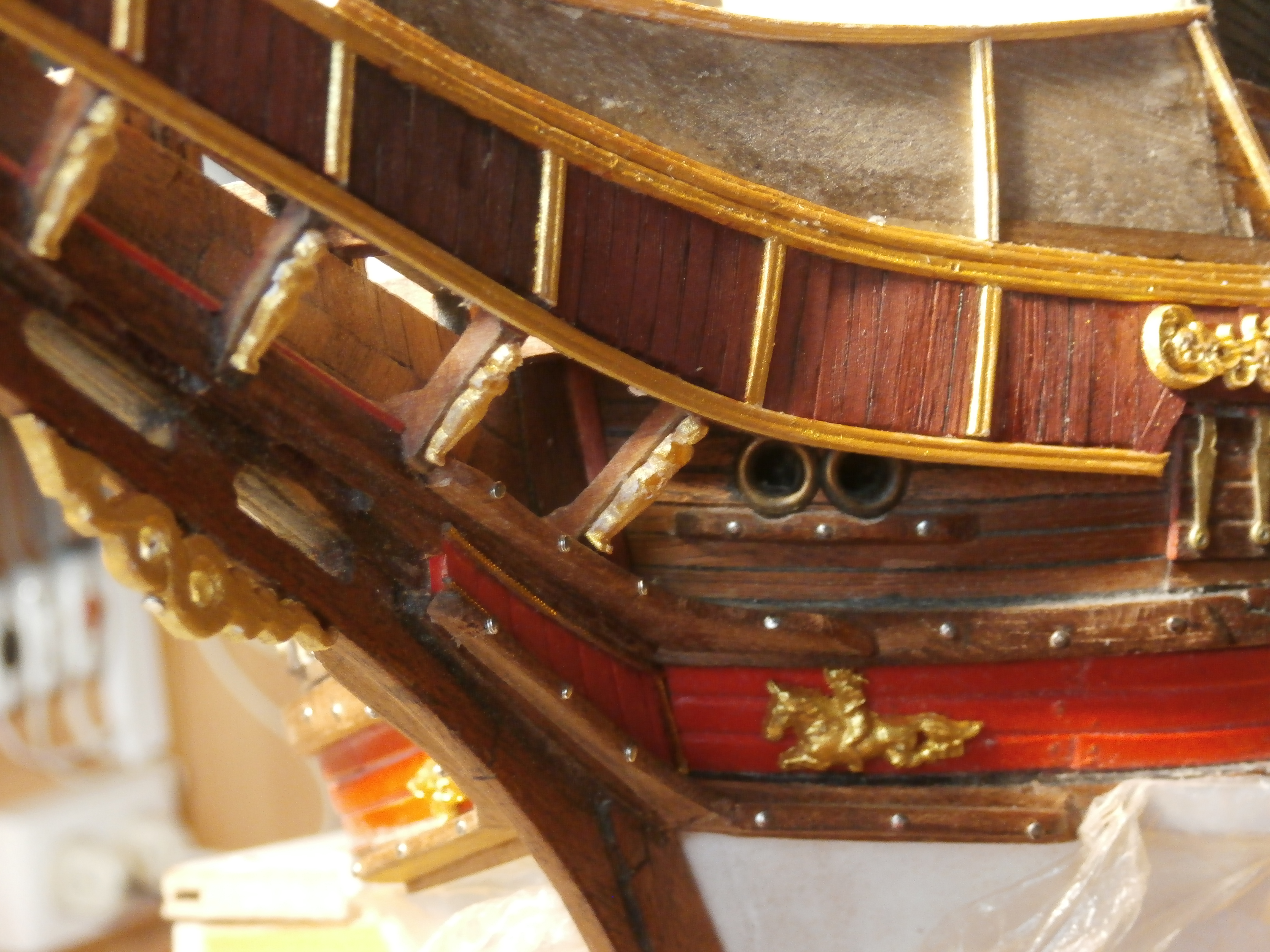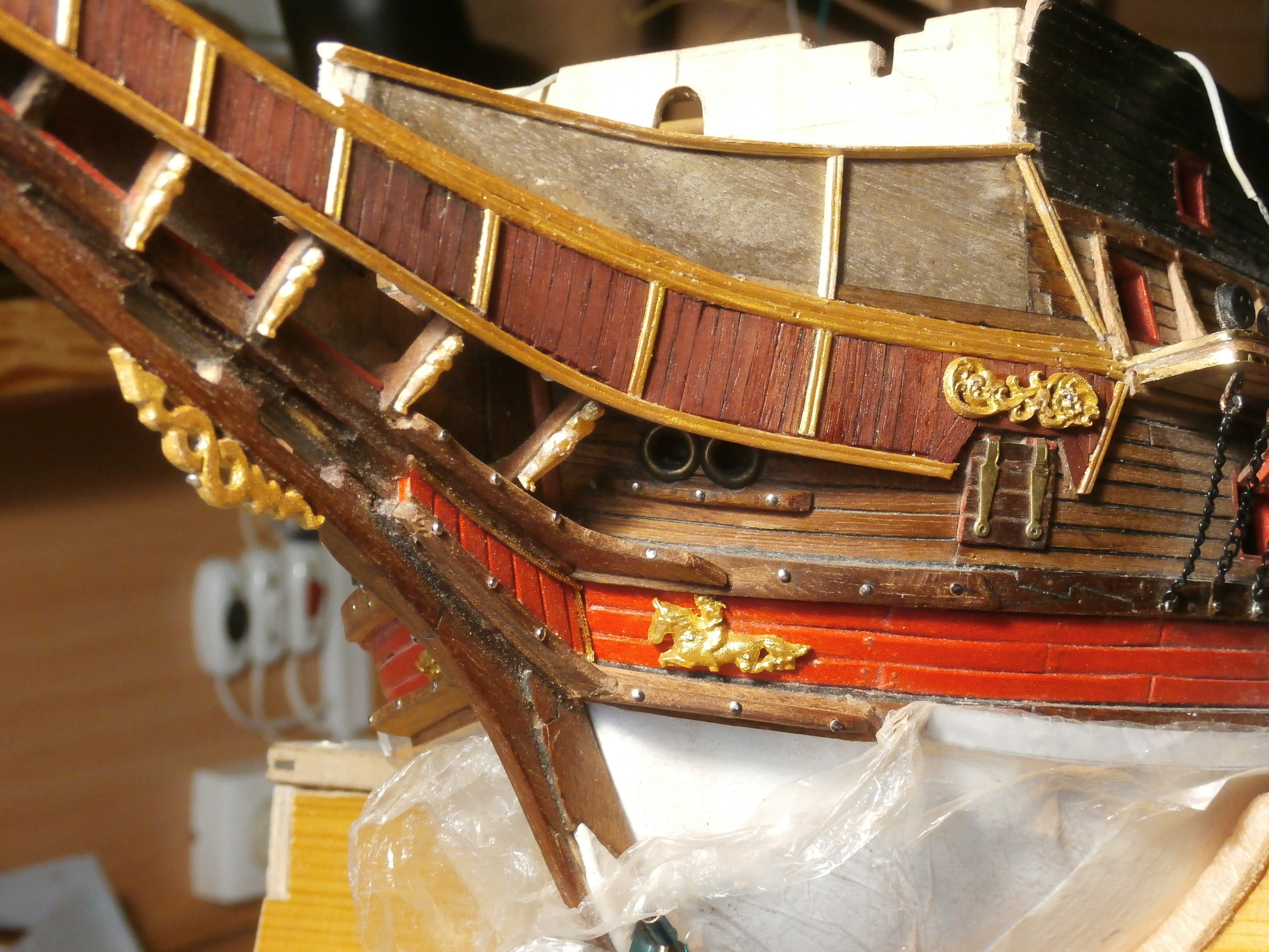 Здравствуйте Сергей Николаевич, мне понравился - изгиб резной - присутствует на носой части , где в верху нижняя мачта и внизу на изгибе - из фанеры сделано орнамент с овалом и клеиться с низу на этом изгибе, хочу такой орнамент из фанеры выпилить ножовкой ручной и покрасить в золотой краской и приклеить на это месте, как у Вас на модели и такой же орнамент сделать поменьше 2 штуки т приклеить под мостиком у меня на корабле держать соединение по бокам мостик , где приклеивается фигурки - лошади с всадником и людей под лошадью , мне этого не хватает орнамента на модели корабля , с уважением Юра