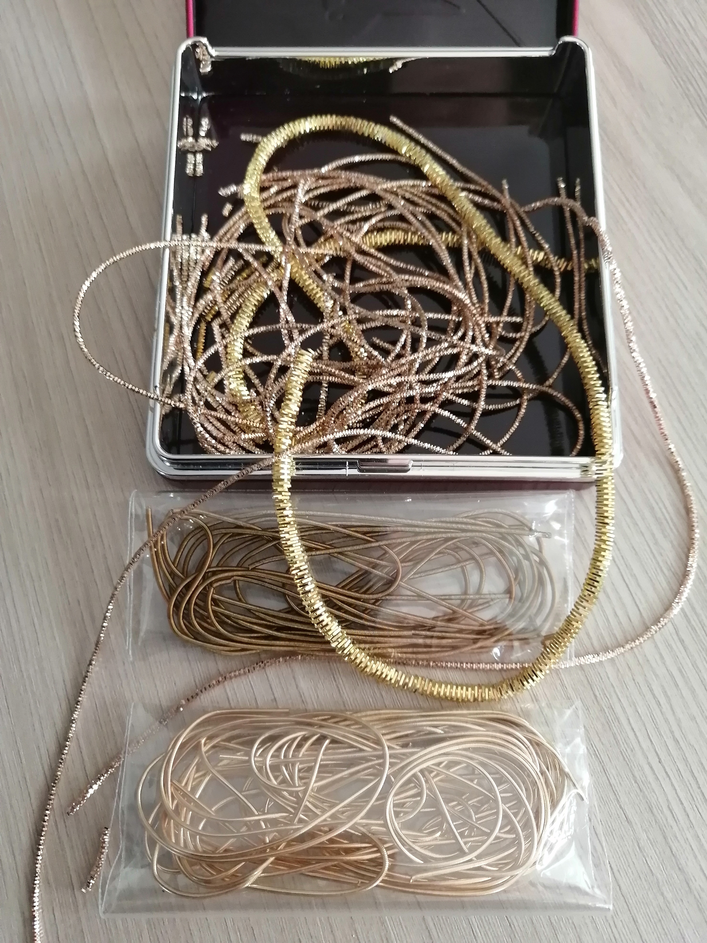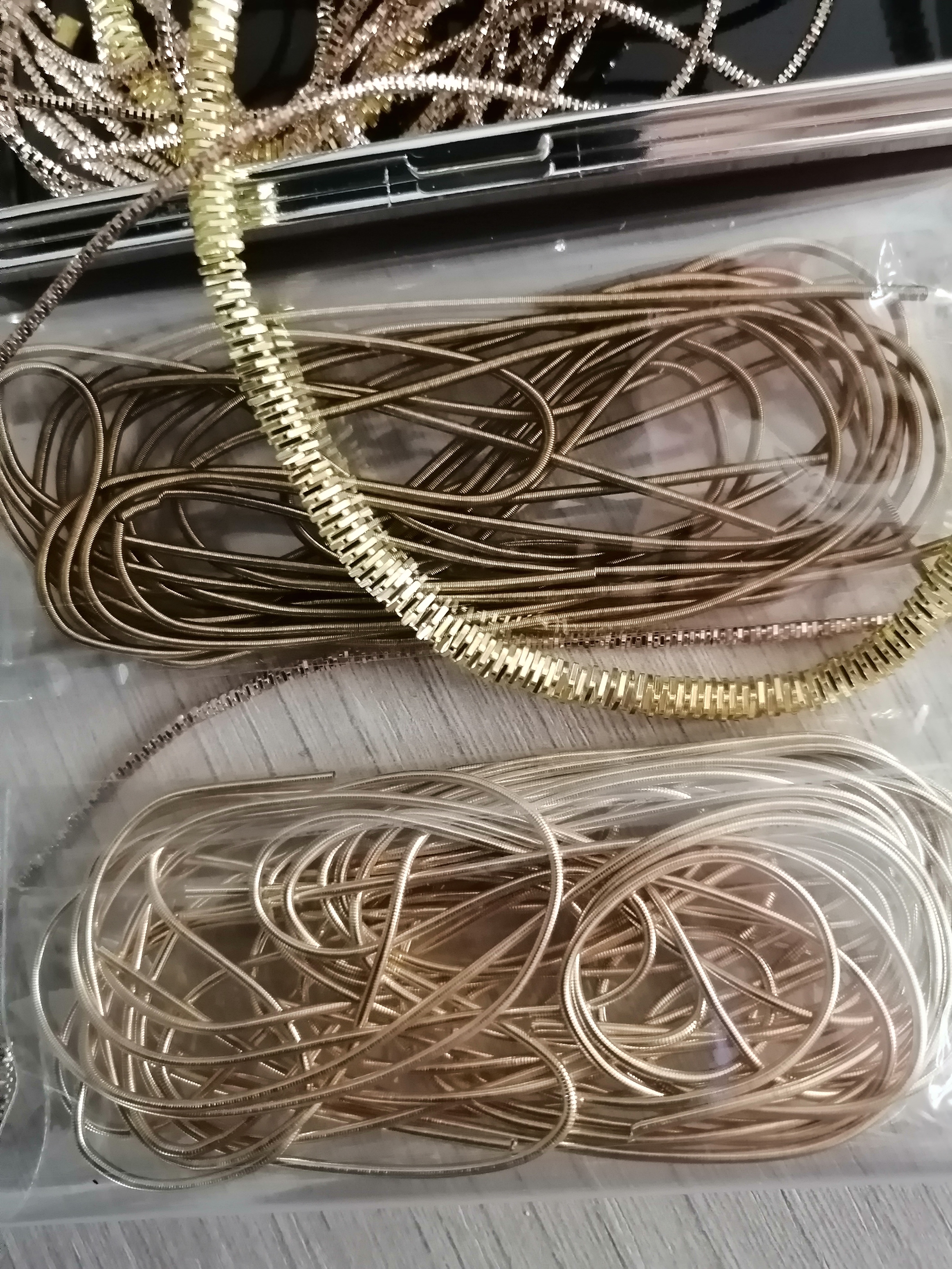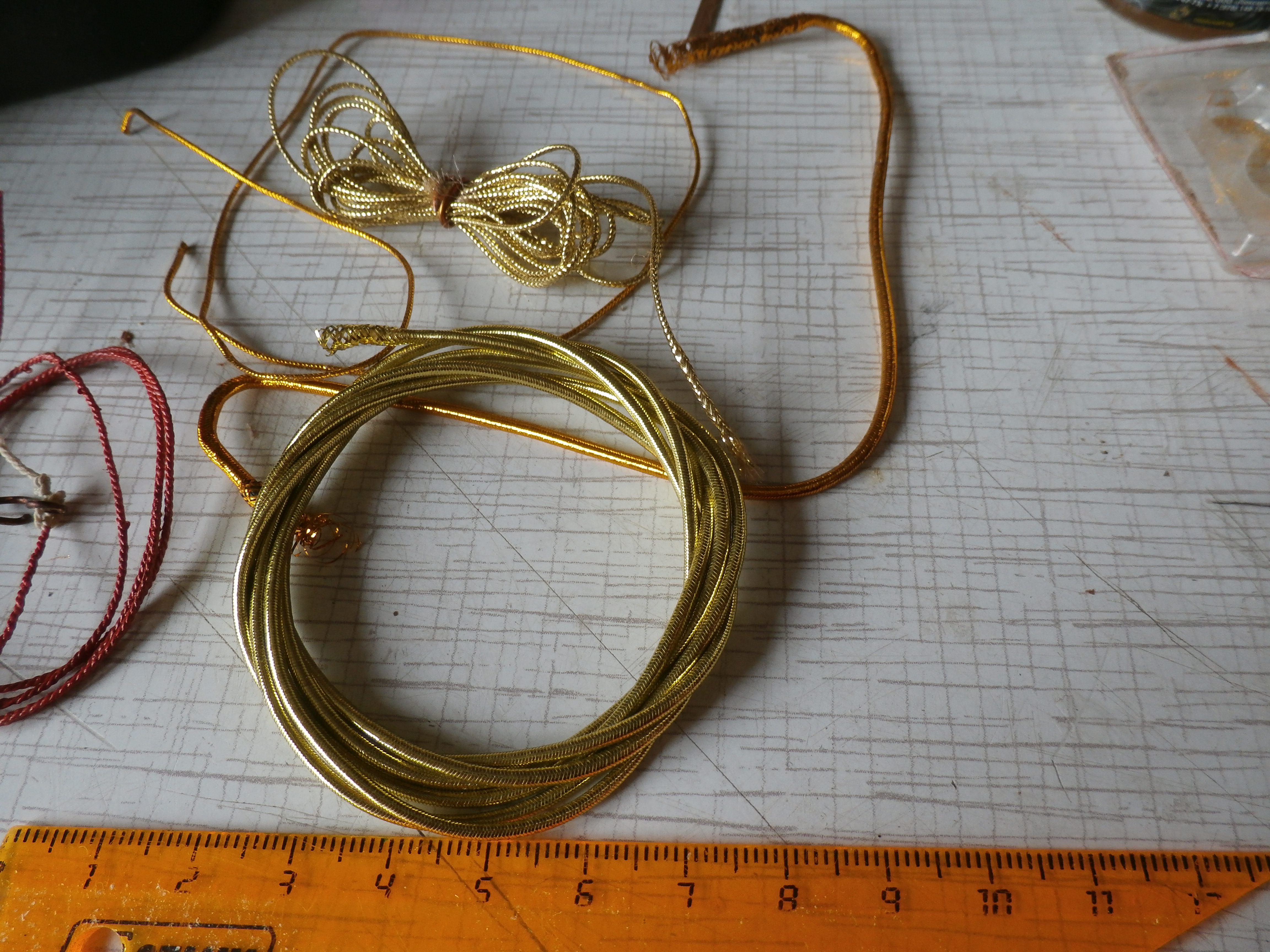 На фото канитель в пакетиках. На третьем "золотая" проволока, даже красить не надо.