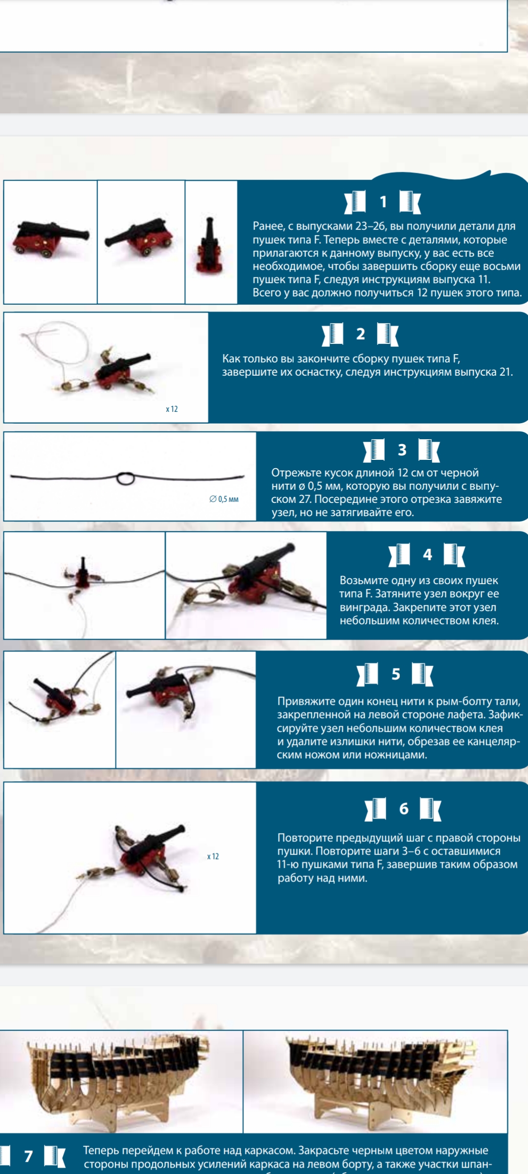 Добрый день. Действительно, для 12-ти пушек, штурвала и румпеля не хватает 57 мм стержня. Мы сообщили фабрике, ждем их решения. Если вы не хотите ждать, вы можете использовать медный провод диаметром 1 мм, либо деревянные шампуры.Бог писал(а): ↑29 май 2022, 16:29 Просматривал инструкции к следующим выпускам, увидел что в 34 выпуске нужно будет собирать много пушек, но вот вопрос у меня почти не осталось латунного стержня, по идее его должны положить в какой нибудь выпуск, но в комплекте он нигде не встречается, и как это понимать?!?