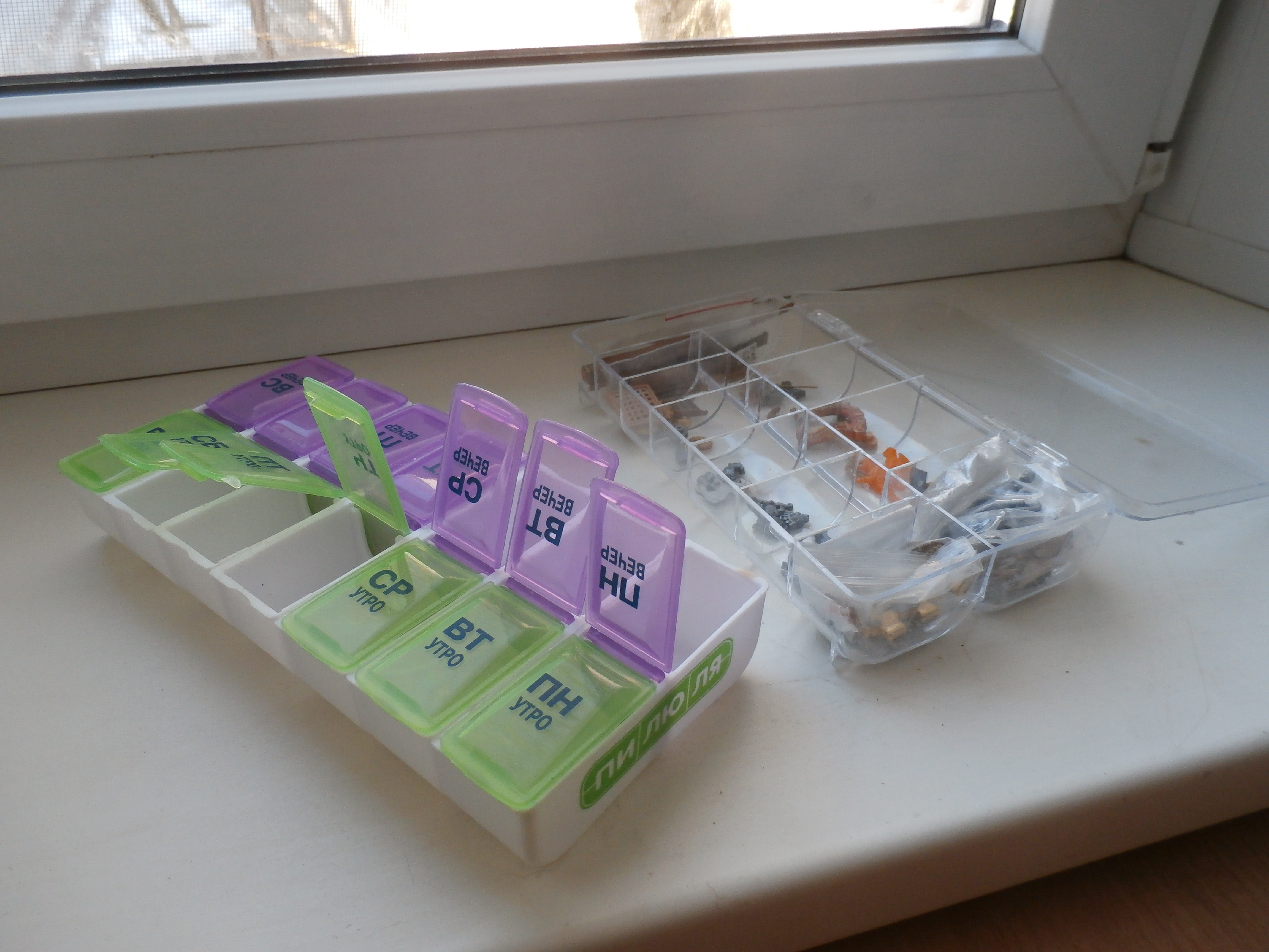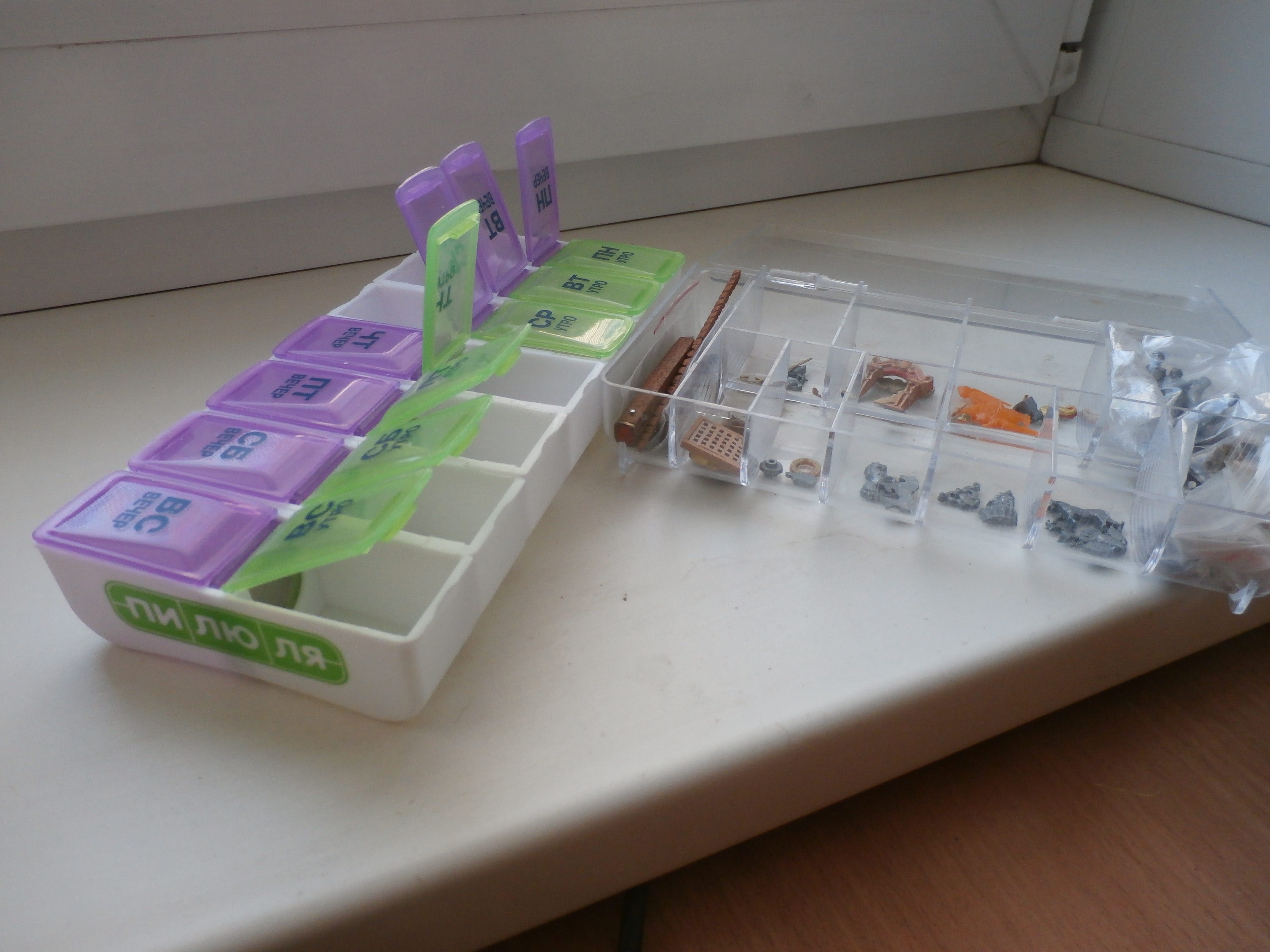 При строительстве модели очень часто приходится изготовлять множество мелких деталей и деталюшек. Возникает проблема: где и как их хранить? Чтобы они были в одном месте, не терялись и не ломались во время хранения. Я для этой цели использовал пластиковую упаковку от конфет. Но мне вчера мой юный друг неожиданно отблагодарствовал специальным устройством из аптеки Устройство называется "ПИЛЮЛЯ". Сегодня я решил поделиться этим подарком со всеми своими коллегами по увлечению, возможно кто то мне скажет, что мне это не нужно, я пока клею только корпус моего корабля, но он не прав! Есть хорошая русская поговорка Знал бы где упасть - соломки бы постелил... Удачи!