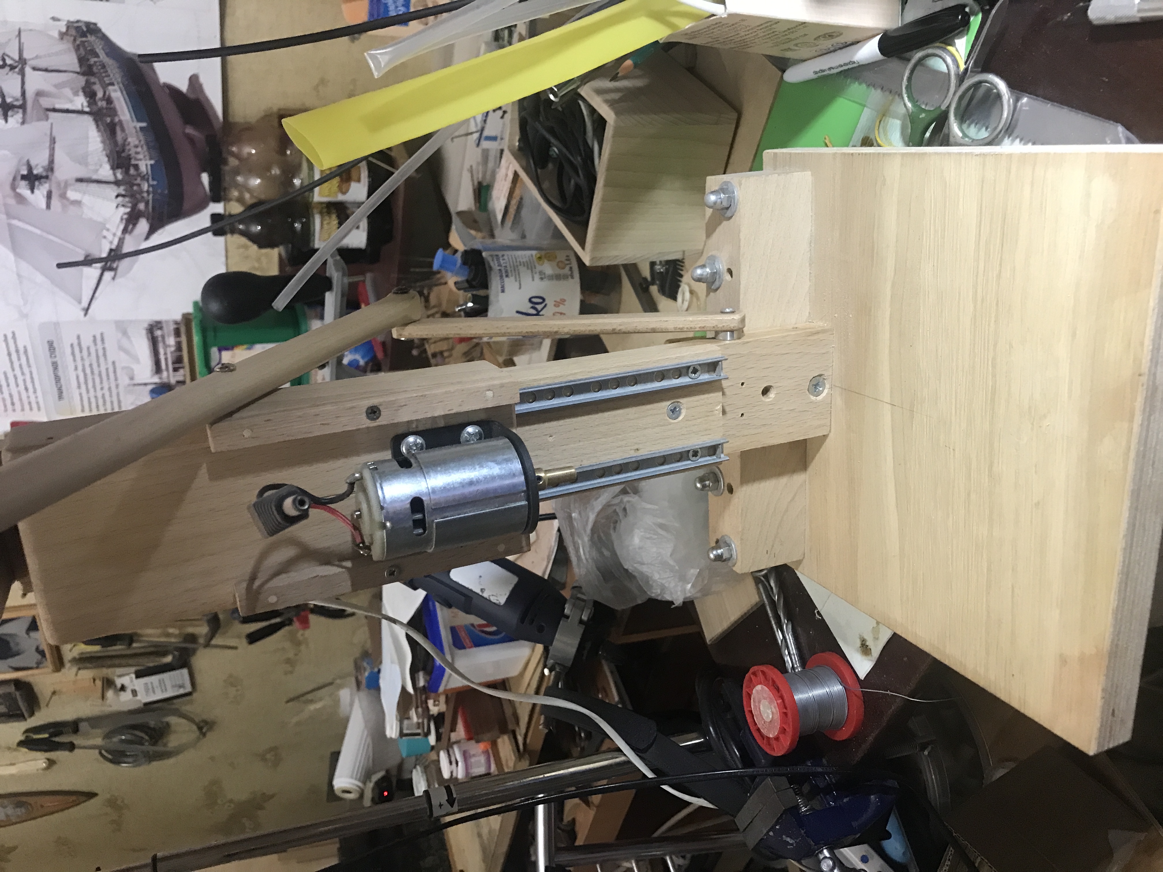 Опыт работа над моделью показал, что небольшой сверлильный станок очень нужен, особенно на поздних стадиях работы. Возможности купить пока не имею - дорого, 3D принтера у меня нет, и я решил сделать себе станок из того, что было под руками. Основание из Толстой фанеры (20мм), стойка из бука, направляющие - мебельные, двигатель от старого шуруповерта, но такой можно найти за $4 на Али, кронштейн и патрон с конусом тоже на Али. И вот что у меня получилось.