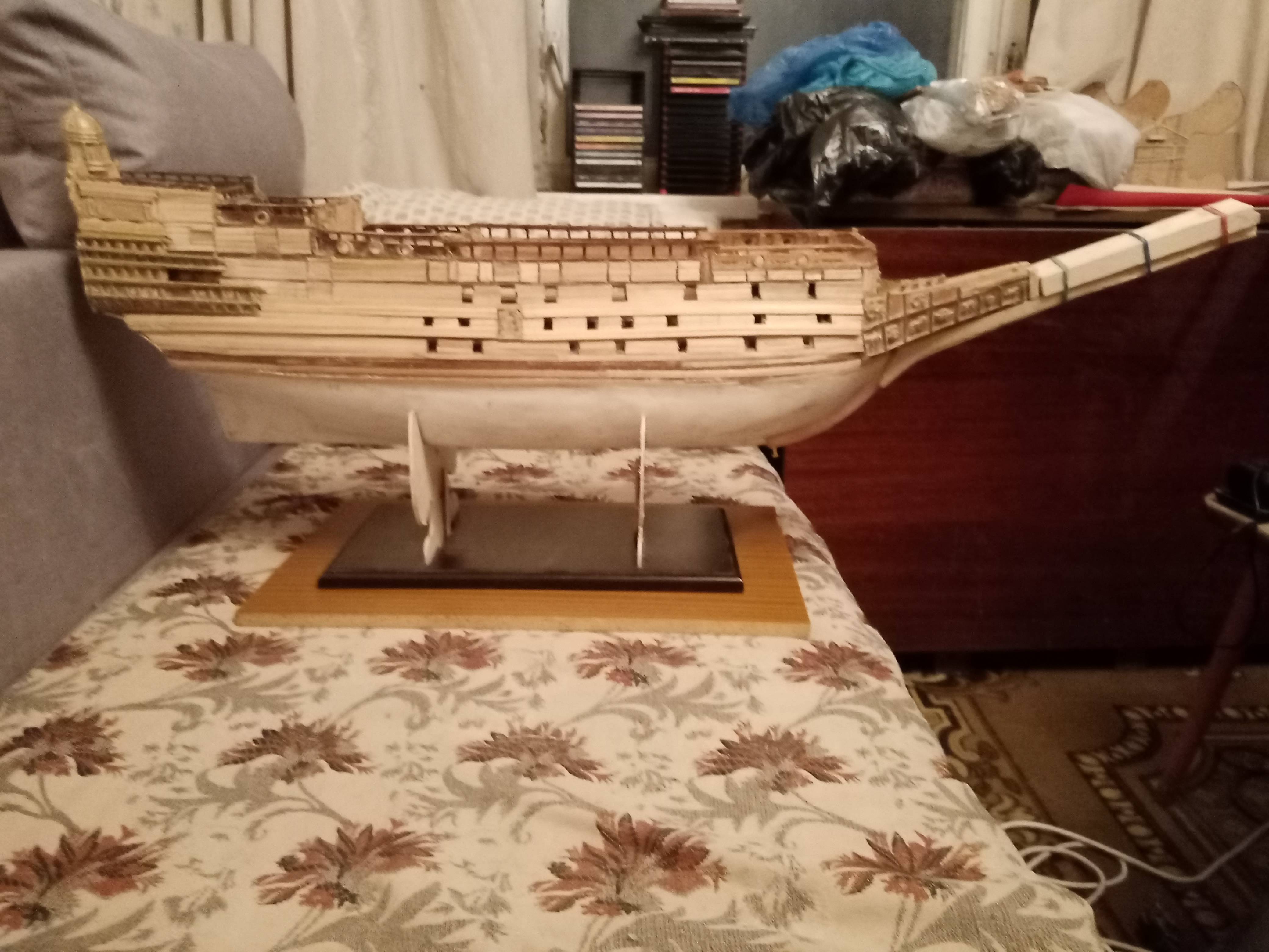 Здравствуйте уважаемые моделисты и участники проекта о постройке корабля - Повелитель Морей - здравствуйте Сергей Николаевич, спасибо за дельный совет и за фотографии Ваши, ч когда собиралина стапеле -2 корабля - Феникс - и - Авось -, сделал на центральной оси - приклеивал шпации из фанерных отрезков и выровнял по центру все шпангоуты и заполнял пространство между шпангоутами шпации из фанерных отрезков и сделал вдоль корпуса малковку и шкурку им зачистил углы чтобы плавно прилегала черновая обшивка рейками - 5/3 млм и чистовая обшивка шпоном 2 ным цвета коричневый орех эи выпиливал все порты на корпусе и обшил порты металлические и на корме приклеил перила и арку и на корабле -Авось - нужно обшить корпус чистовым шпоном 2 ным и еще я делаю на корпусе корабля кардинальную постройку корабля и корпус то же купил для этого черновую обшивку реек планок разного размера и толщины, обклеил ими правую сторону корпуса корабля, для этого пришлось счистить всю атрибутику приклеенуд на корпус корабля и приклеит на это место черновую обшивку шпоном рейками 2 ными от верха где приклеенные перила по бокам корабля , перила пришлось заменить на новые и приклеить стойки на перила, просверлил для этого отверстия на перилах, и до самого низа корабля, где ватерлиния проходит , а на левой стороне корпуса нужно еще приклеить один слой черновой обшивки шпоном рейками и еще ездил в магазин м Новые Черёмушки прикупил рейки черновые шпон разной толщины и ширины длина реек - 30 млм , в разных пачках - , 30 - 50 ште ротщдомб взять прлзаппм на свои к 4 корабля мллео было всего реек , для обложки рейки на кнопки корабля и для укрепления в местах где клеиться фурнитура золотая оформление корабля и юверсы для проводки т крепления такелажа и ещё буду из журнала о постройке корабля мне не нравиться толщина фурнитуры - фанерная - 2 млм буду полностью переделывать фурнитуру из фанеры - 2 млм , кроме фурнитуры из фанеры - стойки крепления для пушек, есть для этого фанера толщина 3 млм и 4 млм , юверсы крепления планки толщина - 4 млм и крепления крепления к юверсам и для массовых вороних гнезд из фанеры толщина - 4 млм и остальную фурнитуру из фанеры толщина - 3 млм , ездил в магазин - Леонардо - купил акриловых красок для покраски корабля и купил себе для корабля - Повелитель морей небольшой баркас - лодочку - Ял - 6 шестивеселную с парусом , буду пропитывать фанерную атрибутику , детали лодочки с обеих сторон житким клеем детали лодочки тонкие могут ломаться и пот сборке корпуса лодочки между шпангоу тами приклеивать шпации - Чернов обшивку рейками , и сделать малковку шкурником по острым углам шпангоутов и носовой шпиль укрепить и удлинить и укрепить саму стойку и крепления к стойке и доделать 2 подставки к корпусу корабля -Повелитель - и крепления высылаю свои фотографии в переделке - Повелитель -