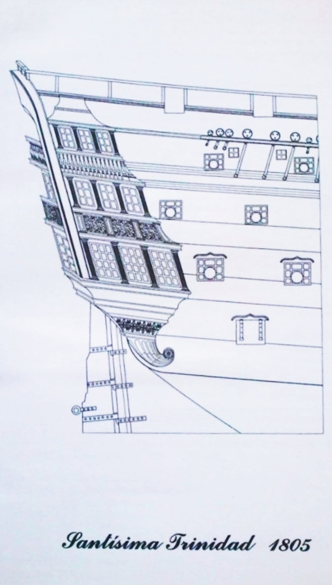 Совсем другой вид, согласитесь?!) Хотя не забываем, что на этом представленном чертеже мы видим, то как корабль выглядил на 1796 год. Интересно, что на нём мы можем видеть львов возлежащих поверх боковых галерей. Этот элемент есть на той самой моделе "Сантисима Тринидад", которая участвовала в съёмки рекламы этой коллекции, если помните!)