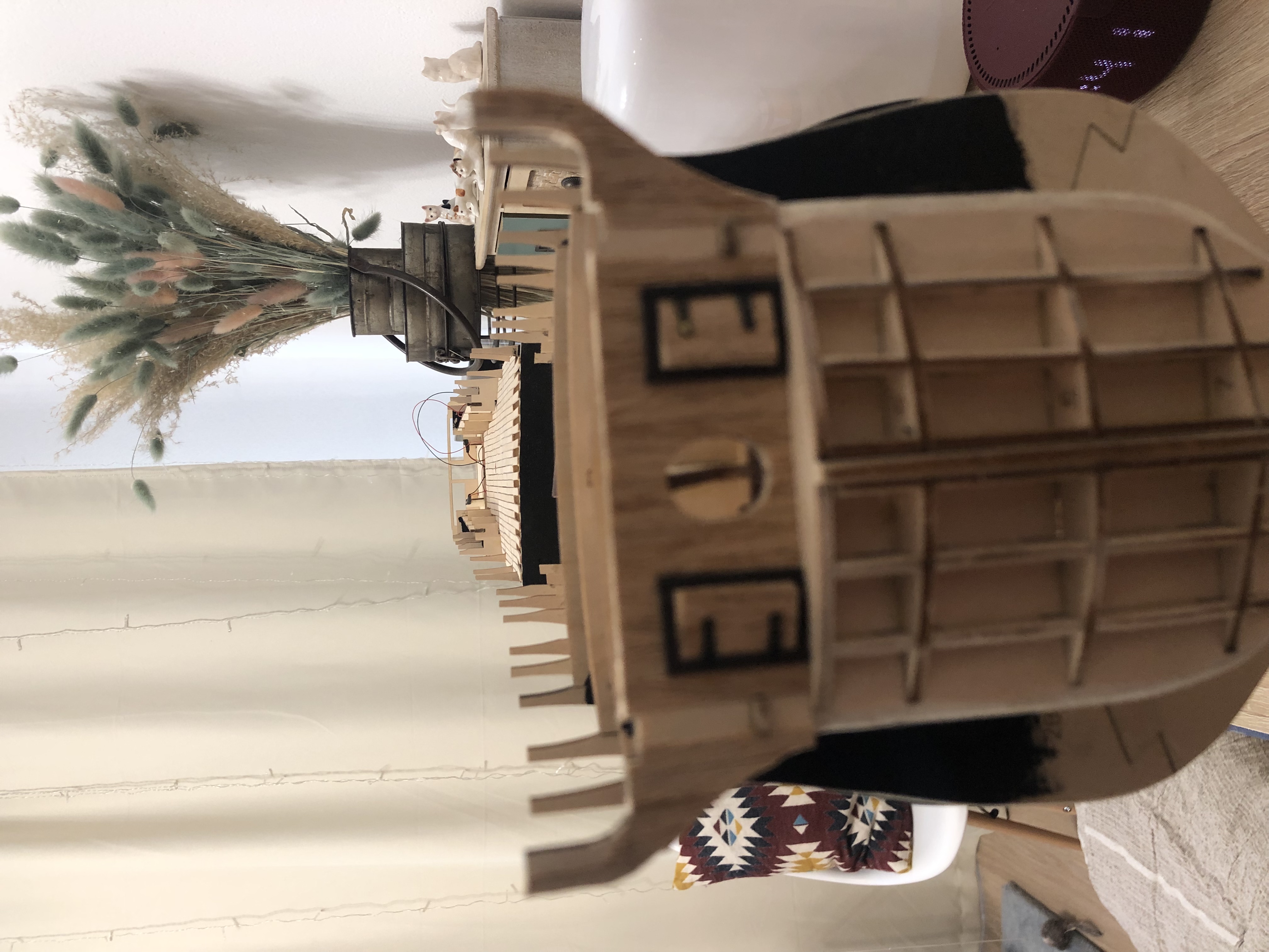 Верхняя палуба. Здесь вариантов не много. Заморить верхнюю палубу морилкой. Лучше конечно морилкой цвета эбеновое дерево ( черный цвет ) Но в принципе и любой другой темной морилкой ( "Махагон", "Мокко"др. ) И после просушки настелить еще один слой новой палубы. От этого модель не пострадает - лишь увеличится конструкционная жесткость корпуса модели, но к сожалению и это добавит расходы на строительство вашей модели. Подумайте, возможно мой пост направит вас к творческому мышлению и вы придумаете что то ещё, но не унывайте, не опускайте руки, в любом случае строительство модели корабля это обязательная цепочка больших и малых загадок которых требуется решить. Вспомните из литературы:" Ай да Пушкин! Ай да сукин сын!!!" Удачи Вам и конечно Здоровья!
