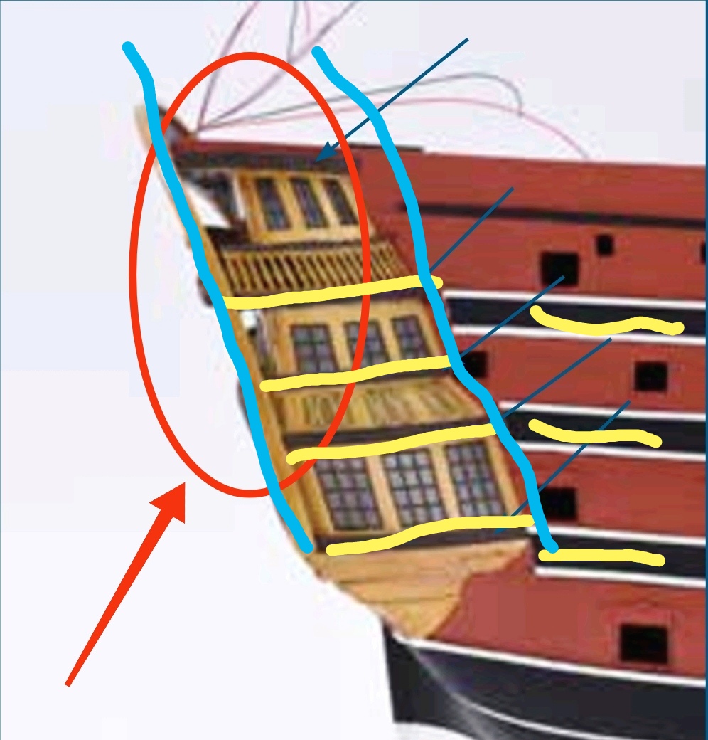 Я имел ввиду если заднюю часть кормы рассматривать отдельно, то пол задней части кормы не параллелен паоубам. А если приглядитесь он отклонён (если провести разрез балкона с каюта и строго перпендикулярно) от самого корпуса короля как бы назад (это судя по фотографии), а вот на чертежах он сделан правильно. Извините, сам не могу правильно сформулировать.
