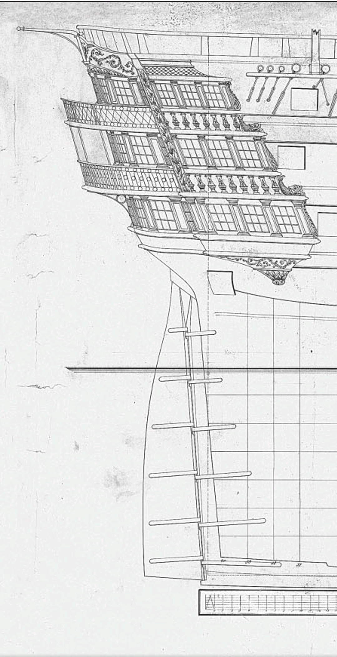 В догончку, камрады, вот ещё одна корма "Тринидад", от РГАВМФ... Совсем другой вид, согласитесь?!) Хотя не забываем, что на этом представленном чертеже мы видим, то как корабль выглядил на 1796 год. Интересно, что на нём мы можем видеть львов возлежащих поверх боковых галерей. Этот элемент есть на той самой моделе "Сантисима Тринидад", которая участвовала в съёмки рекламы этой коллекции, если помните!)