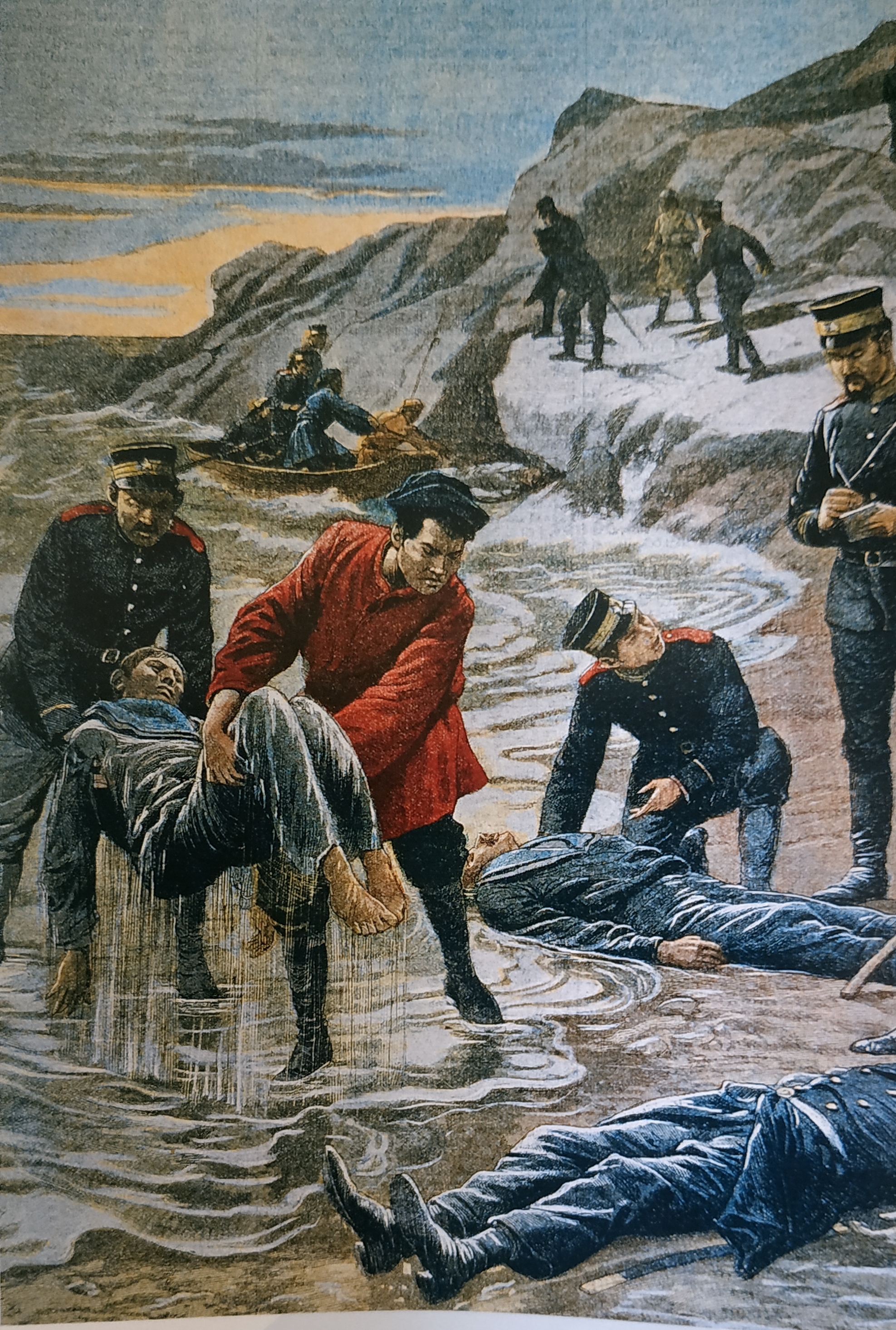 Тут надо сразу напомнить вам, коллеги, что я не историк, я простой обыватель, так сказать, поэтому не претендую абсолютную историчность своих выводов! Так вот я обратил внимание, что картинка обрезана... что от нас скрывают на обрезанной её части, вопрос! Но почему-то погибших людей, которых выносят из воды, предположительно японские военные, называют солдатами, хотя на них морская форма. Если бы нам сказали, что они матросы, ну, или просто моряки, в этом было бы, на мой взгляд, больше правды. Внизу картинки лежит тело, головы которого мы не видим, картинка обрезана. Но этот человек явно был офицером, на нём двубортный бушлат, на поясе ремень с пряжкой, а главное сабля... Меня смутило, что обувь на этом человеке, это высокие ботинки с заправленными в них брюками. Лично у меня сомнения что так носили обувь в Российском императорском флоте в начале XX века. Может поэтому нам и не показывают эту картинку целиком, чтобы мы не смогли в погибших моряках опознать отличный от русского флота людей?