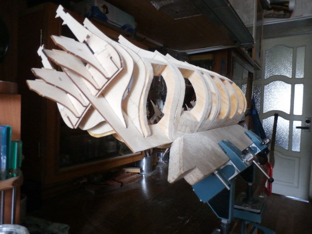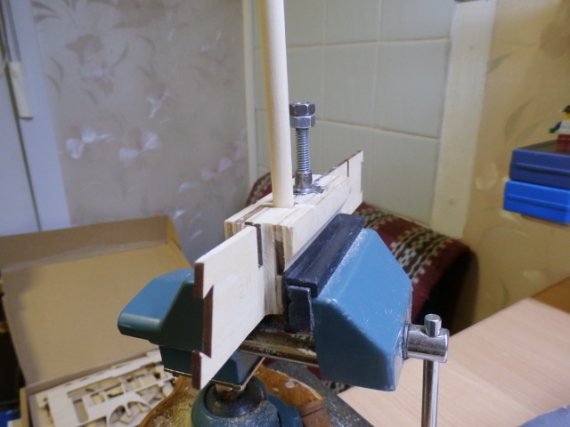 Да уж под мебельными гайками у килевой рамки у меня действительно серьезное основание Я клеил целый пакет фанерных вставок с обоих сторон килевой рамки, причем обе вставки я вставил тоже на клей в распор между шпангоутами, а что бы по-надежней было обе фанерные вставки, килевую рамку скрепил не только клеем но еще и стянул по горизонтали буковыми мебельными шкантами аж Пять штук на каждого! Я все это описал в свое время на своей веточке на 10 и 11 страницах. Я сейчас пишу как мебельная гайка , а на самом деле фактически две гайки - одна с низу, а вторая с верху килевой рамки, через которые по резьбе проходит стальная шпилька! Что бы гайки при рассыхании не выпали из своего гнезда я их для надежности еще и на два шурупа каждую! Но силовые детали в моём кораблике не гайки, а стальные шпильки М 6 , они продаются в магазине КРЕПЕЖ около метра длиной, стоят не дорого. Их можно распиливать по длине как душе угодно. А так как в этом месте по проекту патворка еще и мачта располагается я в этом фанерном пакете еще и степс для мачты обустроил. Получилось надежно!В настоящее время к шпилькам притягиваю брусок. Если брусок с низу- значит модель к верху палубой. Тисочками шаровыми можно расположить модель под любым углом удобным для работы мастеру.