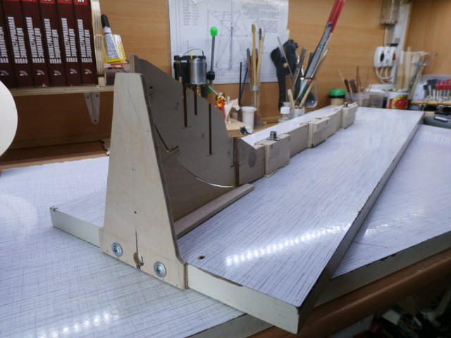 Я в самом начале своего строительства модели, вмонтировал две мебельные гайки на М 6 в килевую рамку модели. В будущем эти шпильки на М 6 будут крепить модель к подставке. Всё это дало мне возможность прикрутить не большой брусок к днищу модели. Купив двое тисочков на шаровой основе я получил возможность выставлять корпус модели под любым удобным для меня углом. как со стороны палубы( днище в низу ), так и к верху днищем если переставить брусок в глубину трюма модели.., Оглядываясь на ушедшее время я не жалею затраченных усилий при сооружении устройства для корпуса модели, это обустройство оправдало себя...