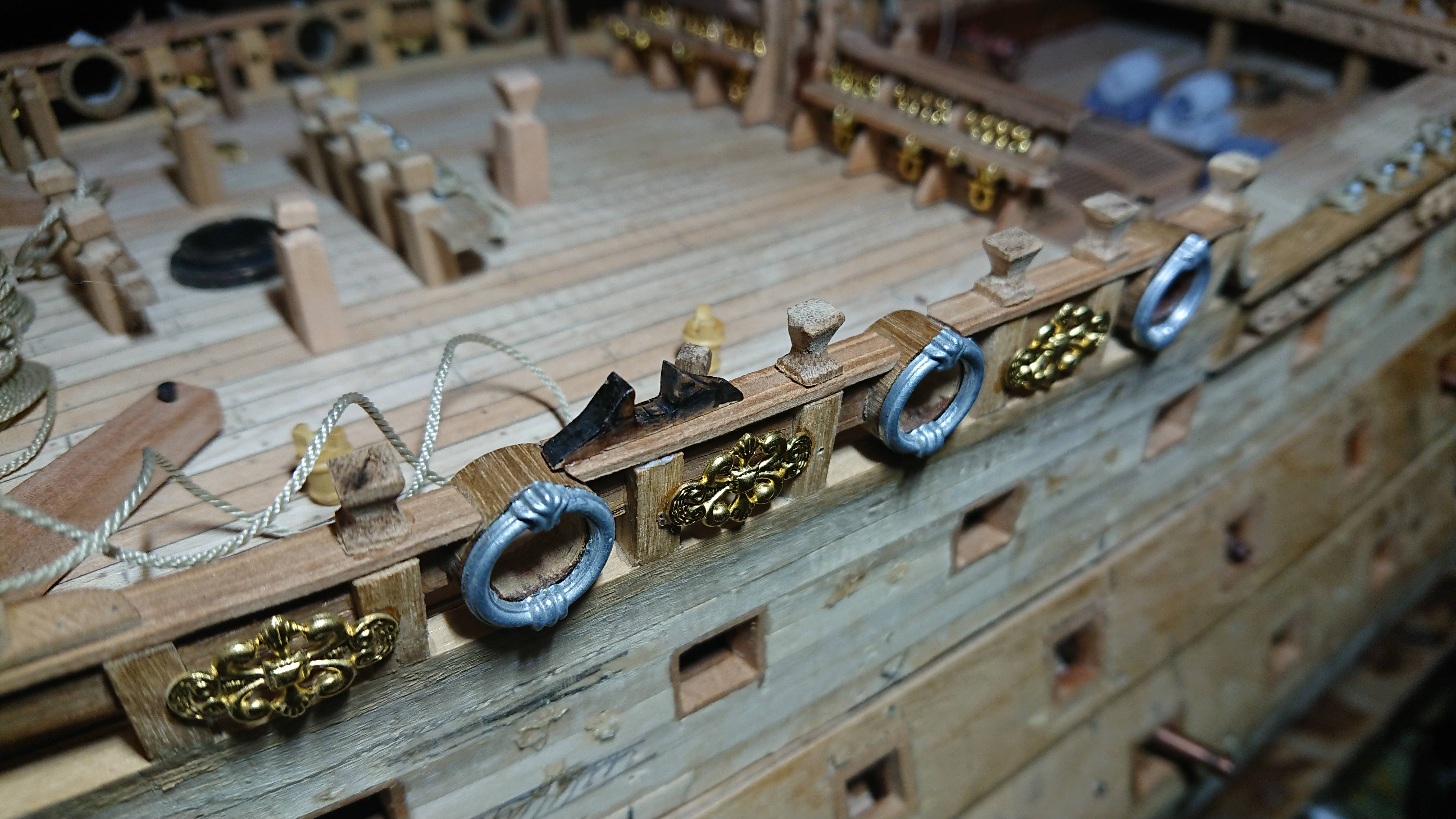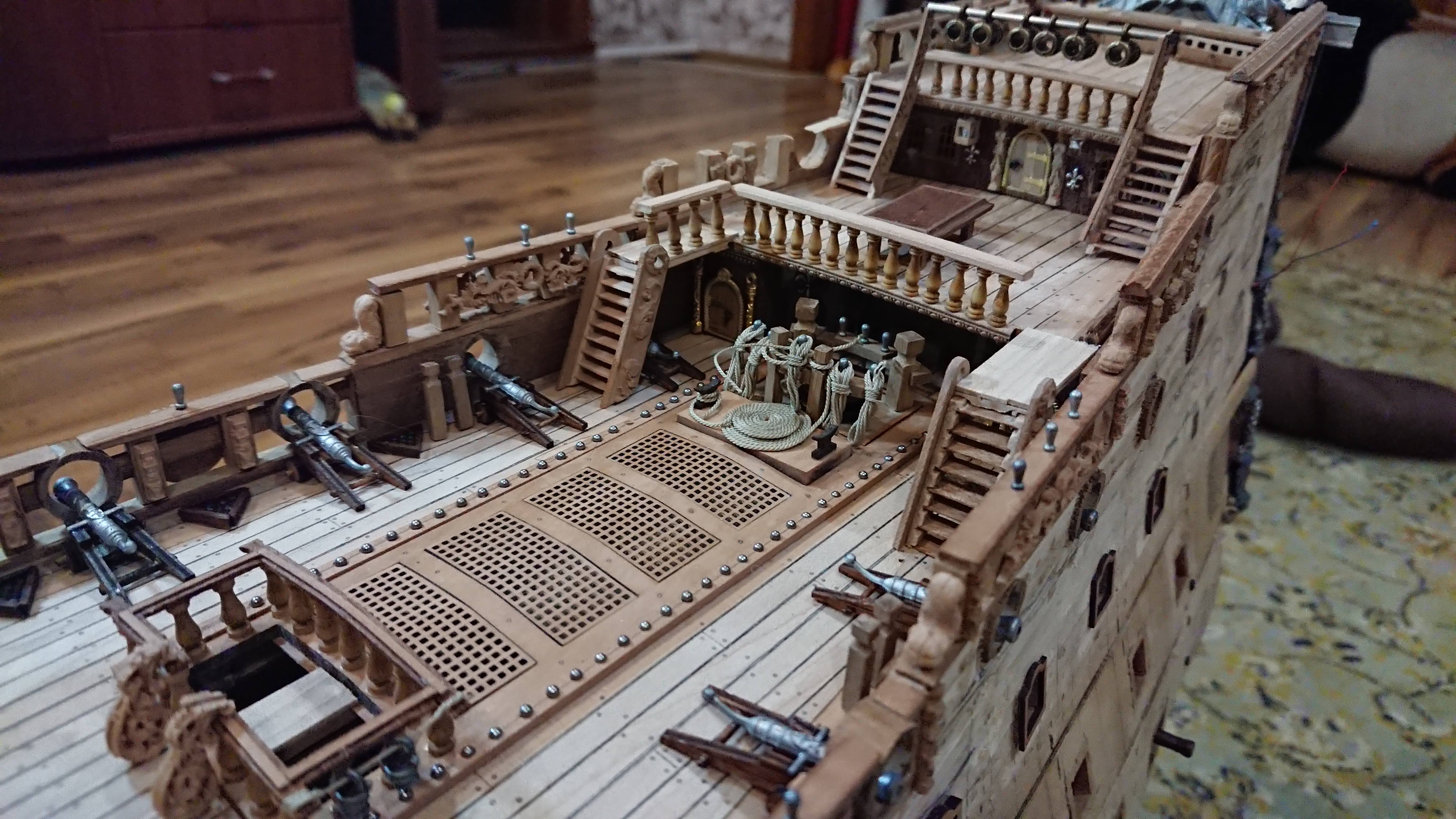 Здравствуйте участник проекта Daantist Royal посмотрел Вашу постройку своего корабля, впечатляет Ваша постройка , только желательно перед установкой на корпус всей фурнитуры и атрибутики, покрывать всю фурнитуру м облицовку корабля грунтовкой потом красить краской акриловой в золотом цвете и пушки тоже грунтовать и красить и всю фурнитуру на которую в будущем связывают канатами тоже красят краской акриловой , для лестниц желательно сделать крепления поручни соединяющие с лецницами, фигурки моряков то де желательно покрасить краской акриловой, задняя корма тоже мне впечатляет здорово получается у Вас и с подсветкой корабля, только не смотрится прикленная фурнитура