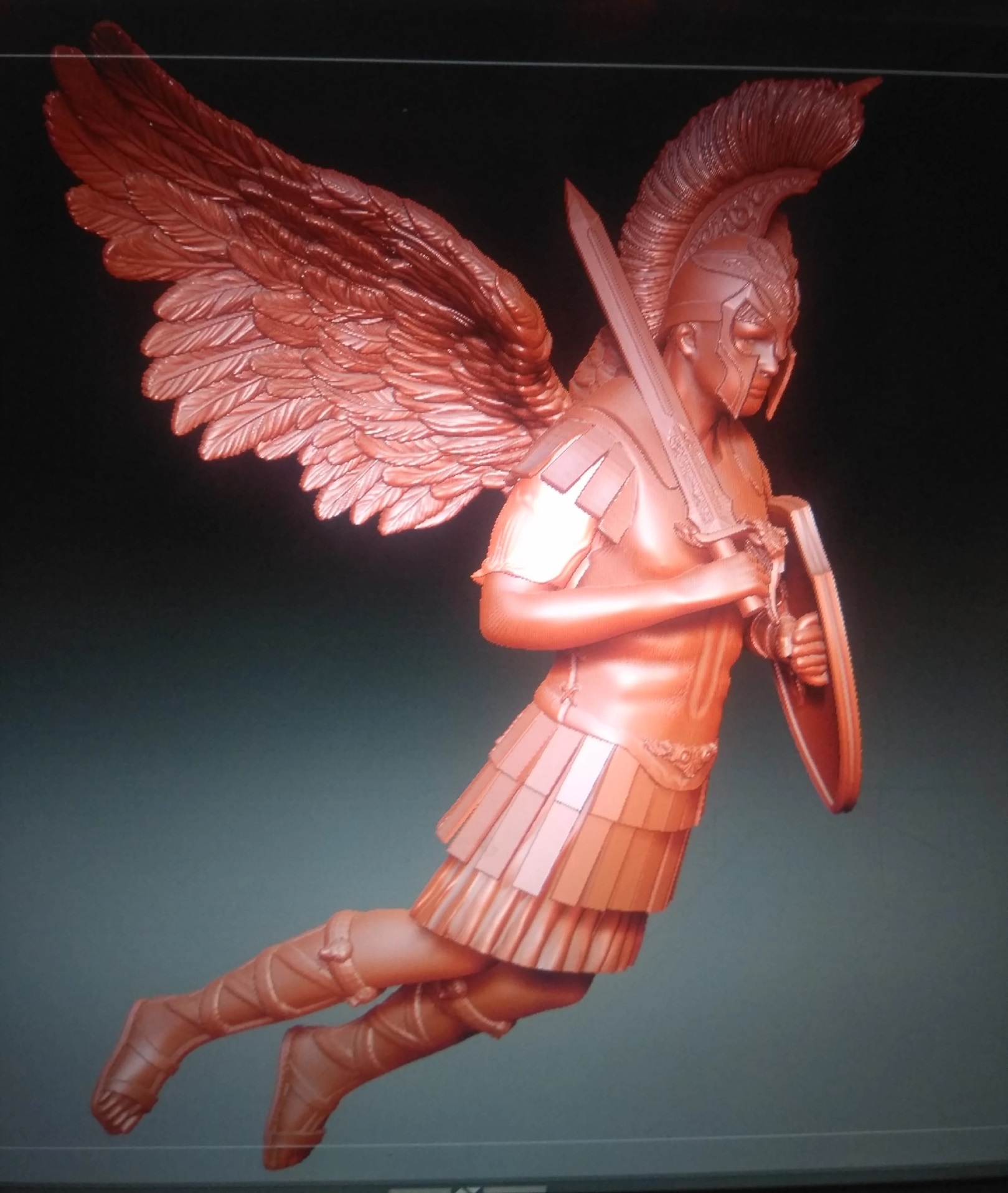 Насчёт щита и эфеса согласен, насчёт крыльев, да, на корабле они были опущены, хотя его часто изображают именно с поднятыми крыльями (специально загуглил). Одежда у него явно древнеримская, шлем, да, гребень великоват и нащёчники лишние, кроме того, ноги не должны быть расставлены.